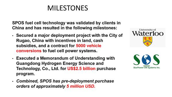MILESTONES SPOS fuel cell technology was validated by clients in China and has resulted in the following milestones: • Secured a major deployment project with the City of Rugao , China with incentives in land, cash subsidies, and a contract for 5000 vehicle conversions to fuel cell power systems. • Executed a Memorandum of Understanding with Guangdong Hydrogen Energy Science and Technology, Co., Ltd. for US$2.5 billion purchase program. • Combined, SPOS has pre - deployment purchase orders of approximately 5 million USD.