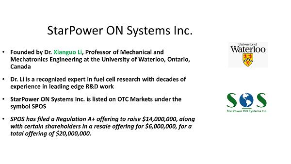 StarPower ON Systems Inc. • Founded by Dr. Xianguo Li , Professor of Mechanical and Mechatronics Engineering at the University of Waterloo, Ontario, Canada • Dr. Li is a recognized expert in fuel cell research with decades of experience in leading edge R&D work • StarPower ON Systems Inc. is listed on OTC Markets under the symbol SPOS • SPOS has filed a Regulation A+ offering to raise $14,000,000, along with certain shareholders in a resale offering for $6,000,000, for a total offering of $20,000,000.