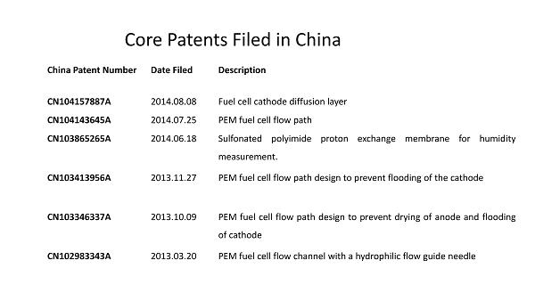 China Patent Number Date Filed Description CN 104157887 A 2014 . 08 . 08 Fuel cell cathode diffusion layer CN 104143645 A 2014 . 07 . 25 PEM fuel cell flow path CN 103865265 A 2014 . 06 . 18 Sulfonated polyimide proton exchange membrane for humidity measurement . CN 103413956 A 2013 . 11 . 27 PEM fuel cell flow path design to prevent flooding of the cathode CN 103346337 A 2013 . 10 . 09 PEM fuel cell flow path design to prevent drying of anode and flooding of cathode CN 102983343 A 2013 . 03 . 20 PEM fuel cell flow channel with a hydrophilic flow guide needle Core Patents Filed in China