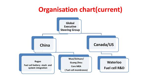 Organisation chart(current) Global Executive Steering Group China Rugao Fuel cell battery stack and system integration Wuxi/Sichuan/ Guang Zhou Core MEA ( fuel cell membranes) Canada/US Waterloo Fuel cell R&D