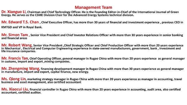 Management Team Dr. Xianguo Li , Chairman and Chief Technology Officer. He is the Founding Editor - in - Chief of the International Journal of Green Energy. He serves as the CSME Division Chair for the Advanced Energy Systems technical division. Mr. Edward T.S. Chan , Chief Executive Officer, has more than 30 years of financial and investment experience , previous CEO in KMTGD and VP in Royal Bank. Mr. Simon Tam , Senior Vice President and Chief Investor Relations Officer with more than 30 years experience in senior banking and financial areas Mr. Robert Wang , Senior Vice President ,Chief Strategic Officer and Chief Production Officer with more than 20 years experience in Mechanical , Electrical and Computer Engineering experience in state - owned manufacturers, government, bank , investment and life insurance companies. Mr. Francis Tan , Chief Operating Officer, general manager in Rugao China with more than 20 years experience as general manager in customs, import and export ,mining companies. Mr. Zhengming Wang , financing development manager in Rugao China with more than 30 years experience as general manager in manufacture, import and export, capital finance, new energy. Ms. Qiong Lin , marketing strategy manager in Rugao China with more than 20 years experience as manager in accounting, travel business and asset management, also certified accountant Ms. Xiaocui Liu , financial controller in Rugao China with more than 20 years experience in accounting, audit area, also certified accountant, certified auditor.