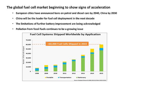 The global fuel cell market beginning to show signs of acceleration • European cities have announced bans on petrol and diesel cars by 2040, China by 2030 • China will be the leader for fuel cell deployment in the next decade • The limitations of further battery improvement are being acknowledged • Pollution from fossil fuels continues to be a growing issue