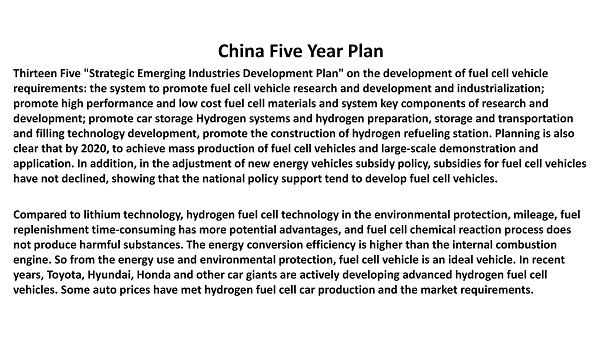 China Five Year Plan (Cont.) Fuel cell vehicles will become the next outlet for the development of new energy vehicles. Although currently in the pre - industrialization stage, with the gradual maturation of fuel cell technology and rapid growth in the number of hydrogen refueling stations being expected, fuel cell vehicles will outbreak in 2020 (According to the Blue Book on China's Hydropower Industry ). “Infrastructure Development” (2016) published in the second half of 2017 estimated that by 2020 , the number of hydrogen refueling stations in China will reach 100, and the number of fuel cell vehicles will reach 10,000. The total output value of the industry will reach 300 billion RMB . The Ministry of Finance, Ministry of Science and Technology, Ministry of Industry and Information Technology and Development and Reform Commission promulgated the "Notice on Adjusting the Policy of Financial Subsidy for the Promotion and Application of New Energy Vehicles", and the subsidy for fuel cell vehicles did not show a decline. Passenger cars for fuel cells are given 200,000 RMB/vehicle subsidies. For fuel cell minivans, buses, a 300,000 RMB subsidies per vehicle. For medium - sized buses, medium and heavy trucks, there are 500,000RMB subsidies per vehicle . The subsidies to fuel cell vehicles will gradually make up for the high price disadvantage and encourage enterprises to increase R & D investment in fuel cell vehicles.