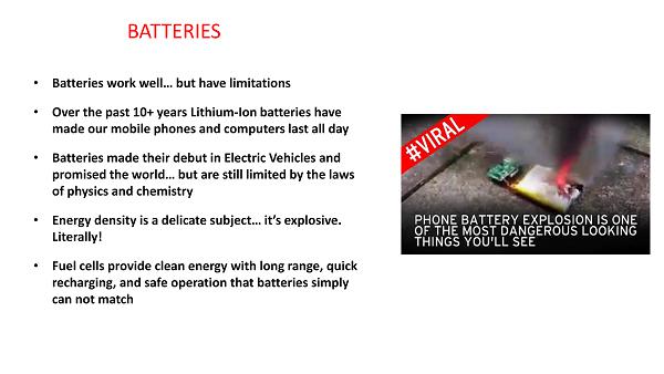 BATTERIES • Batteries work well… but have limitations • Over the past 10+ years Lithium - Ion batteries have made our mobile phones and computers last all day • Batteries made their debut in Electric Vehicles and promised the world… but are still limited by the laws of physics and chemistry • Energy density is a delicate subject… it’s explosive. Literally! • Fuel cells provide clean energy with long range, quick recharging, and safe operation that batteries simply can not match