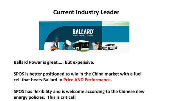 Current Industry Leader Ballard Power is great….. But expensive. SPOS is better positioned to win in the China market with a fuel cell that beats Ballard in Price AND Performance . SPOS has flexibility and is welcome according to the Chinese new energy policies. This is critical!