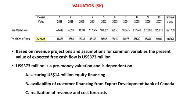 VALUATION ($K) Present 1 2 3 4 5 6 7 8 9 10 Terminal Value 2018 2019 2020 2021 2022 2023 2024 2025 2026 2027 Value Free Cash Flow -20419 -5559 31339 117545 166527 99255 166775 217746 270862 325810 1221789 PV of Cash Flows 372,681 -16336 -3558 16045 48147 54568 26019 34975 36532 36354 34984 104951 • Based on revenue projections and assumptions for common variables the present value of expected free cash flow is US$373 million • US$373 million is a pre - money valuation and is dependent on A. securing US$14 million equity financing B. availability of customer financing from Export Development bank of Canada C. realization of revenue and cost forecasts