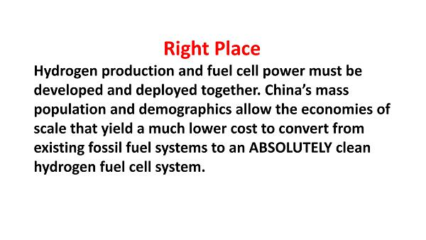 Right Place Hydrogen production and fuel cell power must be developed and deployed together. China’s mass population and demographics allow the economies of scale that yield a much lower cost to convert from existing fossil fuel systems to an ABSOLUTELY clean hydrogen fuel cell system.