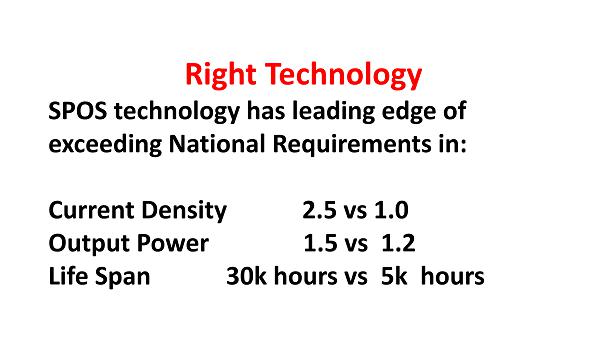 Right Technology SPOS technology has leading edge of exceeding National Requirements in: Current Density 2.5 vs 1.0 Output Power 1.5 vs 1.2 Life Span 30k hours vs 5k hours