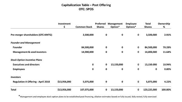 Capitalization Table – Post Offering OTC: SPOS Investment $ Common Stock Preferred Shares Management Option* Employee Options* Total Shares Ownership % Pre - merger shareholders (OTC:KMTG) 3,500,000 0 0 0 3,500,000 2.91% Founder and Management Founder 84,500,000 0 0 0 84,500,000 70.28% Management & seed investors 14,000,000 0 0 0 14,000,000 11.64% Stock Option Incentive Plans Executives and directors 0 0 13,150,000 0 13,150.000 10.94% Employees 0 0 0 0 0 0.00% Investors Regulation A Offering - April 2018 $13,956,000 5,075,000 0 0 0 5,075,000 4.22% Total $13,956,000 107,075,000 0 13,150,000 0 120,225,000 100.00% * Management and employee stock option plans to be established post financing, dilution estimates based on fully issued, fully ves ted, fully exercised