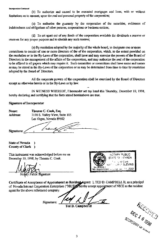 Our opinion set forth herein is limited to the Nevada Business Corporations Act and to the extent that judicial and regulatory orders or decrees or consents, approvals, licenses, authorizations, validations, filings, recordings or registrations for governmental authorities are relevant, to those required under such law.  We express no opinion and make no representation with respect to any other laws or the law of any other jurisdiction.