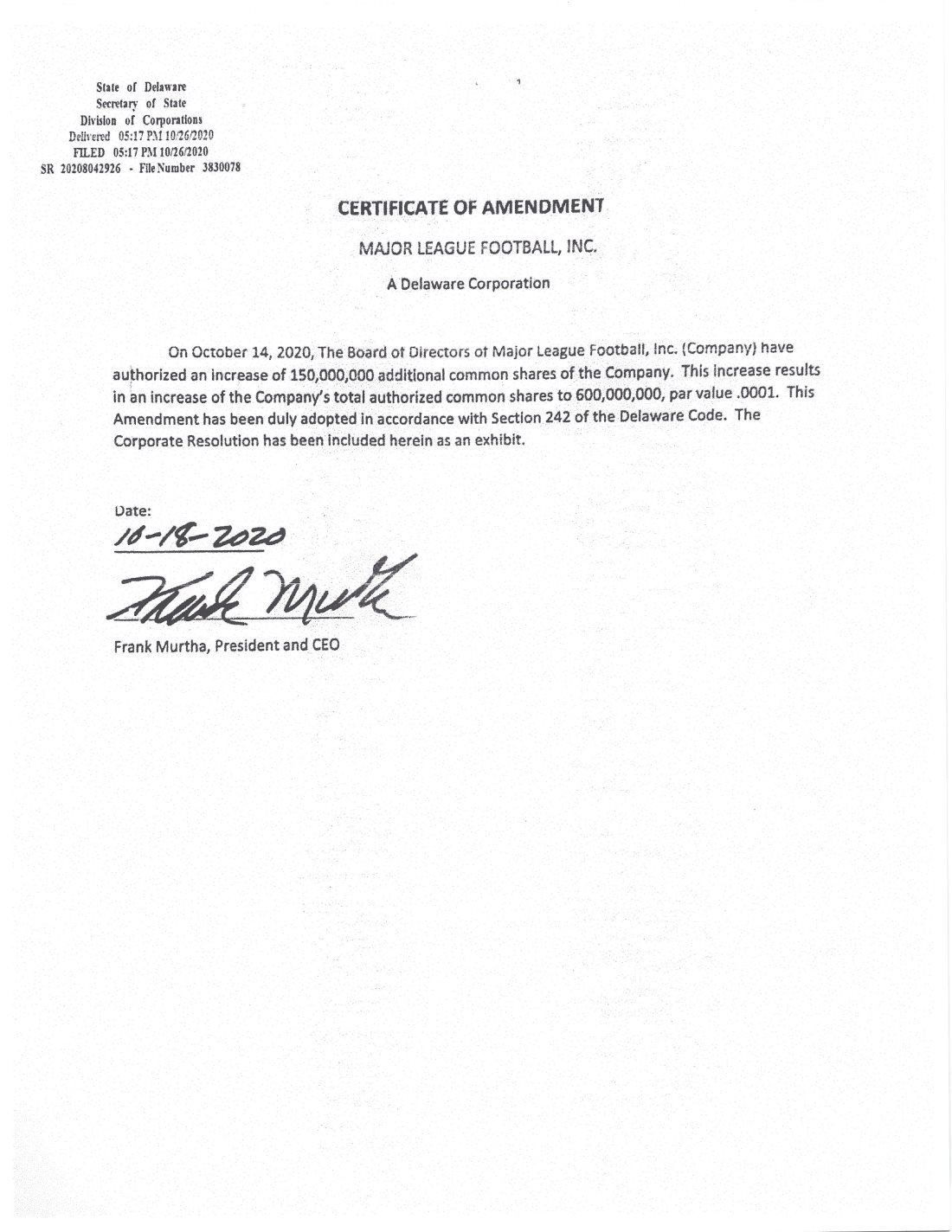 By this Offering Circular, Major League Football, Inc., a Delaware corporation, is offering for sale a maximum of 125,000,000 shares of its common stock (the “Offered Shares”), at a fixed price of $[0.01-0.05] per share, pursuant to Tier 2 of Regulation A of the United States Securities and Exchange Commission (the “SEC”). A minimum purchase of $5,000 of the Offered Shares is required in this offering; any additional purchase must be in an amount of at least $1,000. This offering is being conducted on a best-efforts basis, which means that there is no minimum number of Offered Shares that must be sold by us for this offering to close; thus, we may receive no or minimal proceeds from this offering. All proceeds from this offering will become immediately available to us and may be used as they are accepted. Purchasers of the Offered Shares will not be entitled to a refund and could lose their entire investments. Please see the “Risk Factors” section, beginning on page 4, for a discussion of the risks associated with a purchase of the Offered Shares.