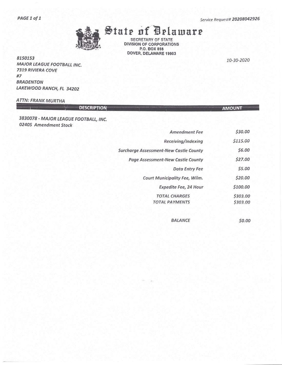 (a) a single executed counterpart of the Subscription Agreement, which shall be delivered to the Company either by (1) physical delivery to: Major League Football, Inc., Attention: Frank Murtha, Chief Executive Officer, 15515 Lemon Fish Drive, Lakewood Ranch, Florida 34202; (2) e-mail to: F.Murtha@mlfb.com; and