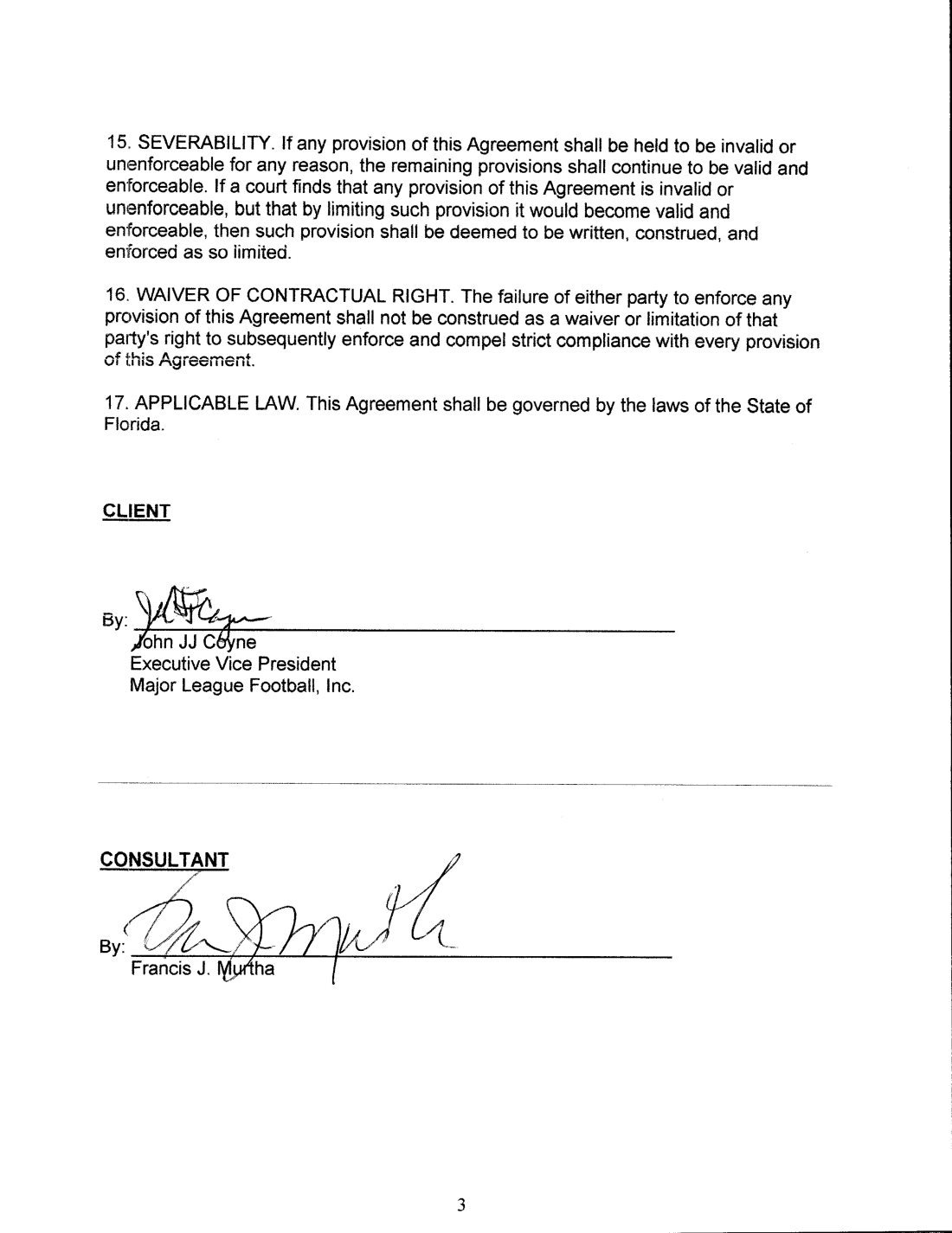 7. Notices. Notice, requests, demands and other communications relating to this Subscription Agreement and the transactions contemplated herein shall be in writing and shall be deemed to have been duly given if and when (a) delivered personally, on the date of such delivery; or (b) mailed by registered or certified mail, postage prepaid, return receipt requested, in the third day after the posting thereof; or (c) e-mailed on the date of such delivery to the address of the respective parties as follows, if to the Company, to Major League Football, Inc., 15515 Lemon Fish Drive, Lakewood Ranch, Florida 34202, Attention: Frank Murtha, Chief Executive Officer. If to Investor, at Investor’s address supplied in connection herewith, or to such other address as may be specified by written notice from time to time by the party entitled to receive such notice. Any notices, requests, demands or other communications by email shall be confirmed by letter given in accordance with (a) or (b) above.