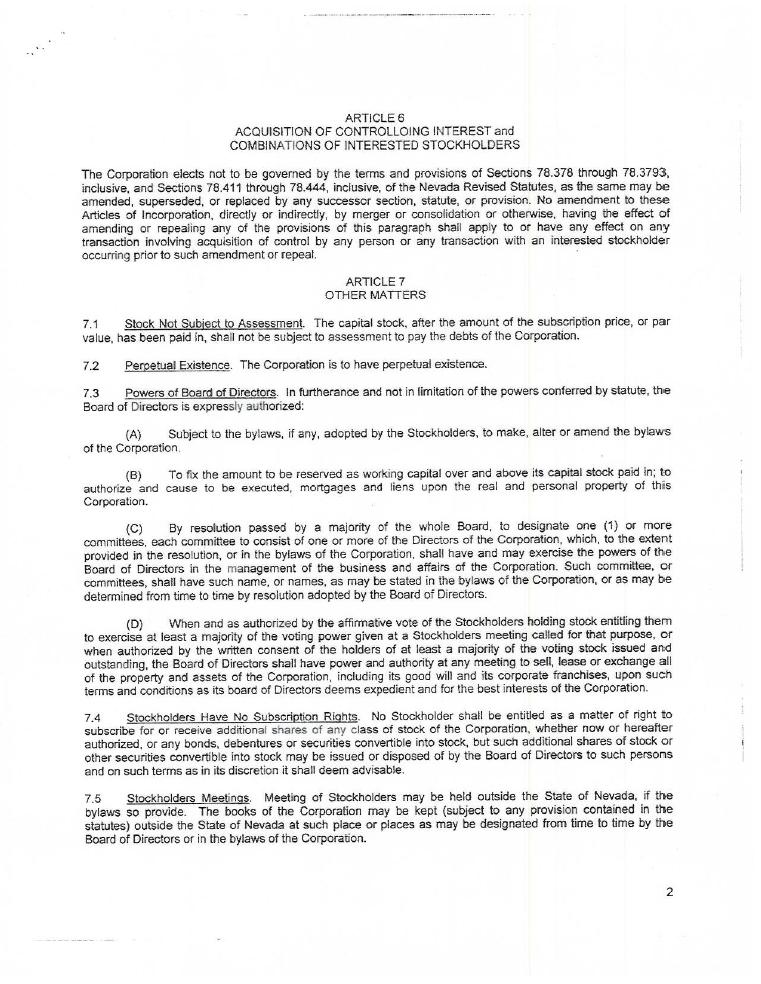 EXHIBIT 2.1 ARTICLES OF INCORPORATION