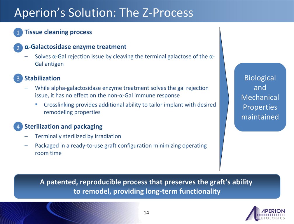 *  Tissue cleaning processα-Galactosidase enzyme treatmentSolves α-Gal rejection issue by cleaving the terminal galactose of the α-Gal antigenStabilizationWhile alpha-galactosidase enzyme treatment solves the gal rejection issue, it has no effect on the non-α-Gal immune responseCrosslinking provides additional ability to tailor implant with desired remodeling propertiesSterilization and packagingTerminally sterilized by irradiationPackaged in a ready-to-use graft configuration minimizing operating room time  Aperion’s Solution: The Z-Process  A patented, reproducible process that preserves the graft’s ability to remodel, providing long-term functionality  2  3  4  1  Biological and Mechanical Properties maintained