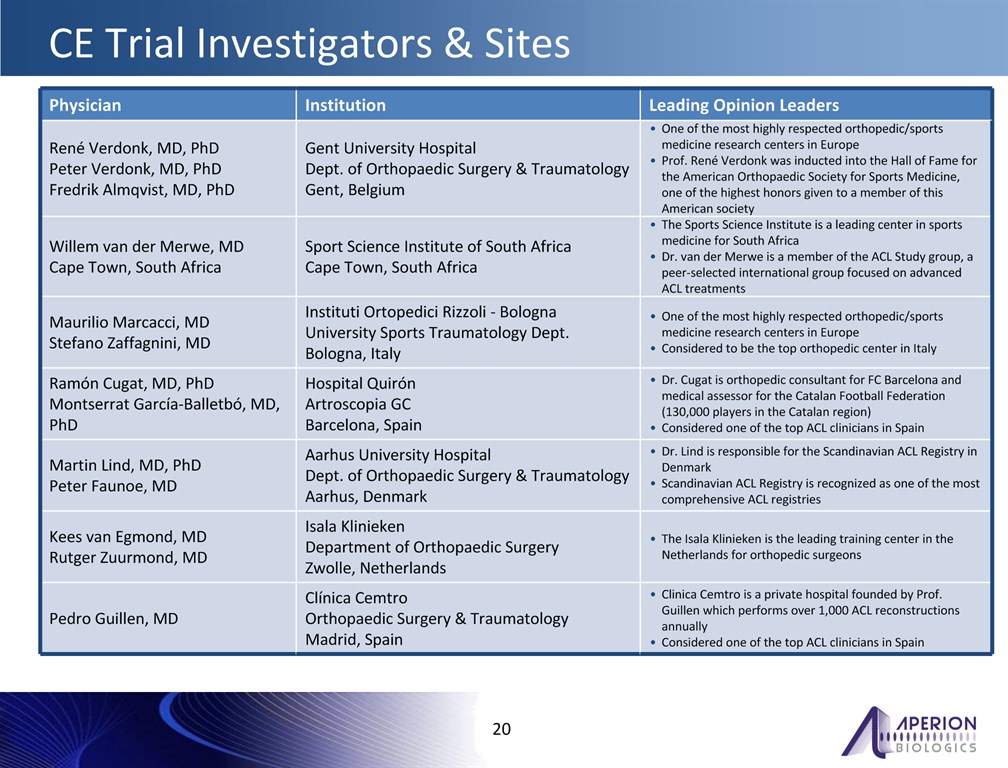 *    Physician  Institution  Leading Opinion Leaders  René Verdonk, MD, PhDPeter Verdonk, MD, PhDFredrik Almqvist, MD, PhD  Gent University Hospital Dept. of Orthopaedic Surgery & TraumatologyGent, Belgium  One of the most highly respected orthopedic/sports medicine research centers in Europe Prof. René Verdonk was inducted into the Hall of Fame for the American Orthopaedic Society for Sports Medicine, one of the highest honors given to a member of this American society  Willem van der Merwe, MDCape Town, South Africa  Sport Science Institute of South AfricaCape Town, South Africa  The Sports Science Institute is a leading center in sports medicine for South AfricaDr. van der Merwe is a member of the ACL Study group, a peer-selected international group focused on advanced ACL treatments  Maurilio Marcacci, MDStefano Zaffagnini, MD  Instituti Ortopedici Rizzoli - Bologna University Sports Traumatology Dept. Bologna, Italy  One of the most highly respected orthopedic/sports medicine research centers in Europe Considered to be the top orthopedic center in Italy  Ramón Cugat, MD, PhDMontserrat García-Balletbó, MD, PhD  Hospital Quirón Artroscopia GCBarcelona, Spain  Dr. Cugat is orthopedic consultant for FC Barcelona and medical assessor for the Catalan Football Federation (130,000 players in the Catalan region)Considered one of the top ACL clinicians in Spain  Martin Lind, MD, PhDPeter Faunoe, MD  Aarhus University HospitalDept. of Orthopaedic Surgery & TraumatologyAarhus, Denmark  Dr. Lind is responsible for the Scandinavian ACL Registry in DenmarkScandinavian ACL Registry is recognized as one of the most comprehensive ACL registries  Kees van Egmond, MDRutger Zuurmond, MD  Isala KliniekenDepartment of Orthopaedic SurgeryZwolle, Netherlands  The Isala Klinieken is the leading training center in the Netherlands for orthopedic surgeons  Pedro Guillen, MD  Clínica CemtroOrthopaedic Surgery & TraumatologyMadrid, Spain  Clinica Cemtro is a private hospital founded by Prof. Guillen which performs over 1,000 ACL reconstructions annuallyConsidered one of the top ACL clinicians in Spain  CE Trial Investigators & Sites