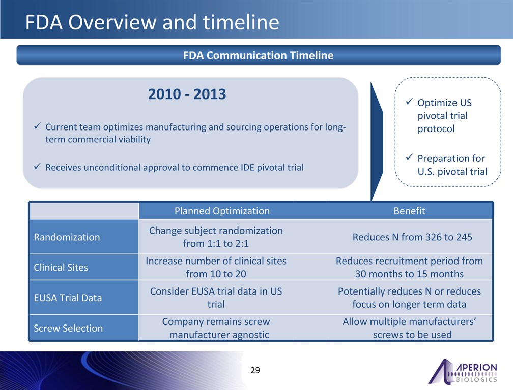 Current team optimizes manufacturing and sourcing operations for long-term commercial viabilityReceives unconditional approval to commence IDE pivotal trial  *  FDA Overview and timeline  2010 - 2013  FDA Communication Timeline  Optimize US pivotal trial protocolPreparation for U.S. pivotal trial     Planned Optimization    Benefit   Randomization   Change subject randomization from 1:1 to 2:1    Reduces N from 326 to 245  Clinical Sites  Increase number of clinical sites from 10 to 20    Reduces recruitment period from 30 months to 15 months  EUSA Trial Data  Consider EUSA trial data in US trial    Potentially reduces N or reduces focus on longer term data  Screw Selection  Company remains screw manufacturer agnostic    Allow multiple manufacturers’ screws to be used