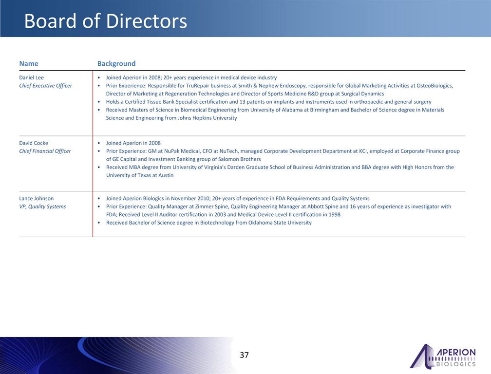 *  Board of Directors  Name  Background  Daniel LeeChief Executive Officer  Joined Aperion in 2008; 20+ years experience in medical device industryPrior Experience: Responsible for TruRepair business at Smith & Nephew Endoscopy, responsible for Global Marketing Activities at OsteoBiologics, Director of Marketing at Regeneration Technologies and Director of Sports Medicine R&D group at Surgical DynamicsHolds a Certified Tissue Bank Specialist certification and 13 patents on implants and instruments used in orthopaedic and general surgeryReceived Masters of Science in Biomedical Engineering from University of Alabama at Birmingham and Bachelor of Science degree in Materials Science and Engineering from Johns Hopkins University  David CockeChief Financial Officer  Joined Aperion in 2008Prior Experience: GM at NuPak Medical, CFO at NuTech, managed Corporate Development Department at KCI, employed at Corporate Finance group of GE Capital and Investment Banking group of Salomon BrothersReceived MBA degree from University of Virginia’s Darden Graduate School of Business Administration and BBA degree with High Honors from the University of Texas at Austin   Lance JohnsonVP, Quality Systems  Joined Aperion Biologics in November 2010; 20+ years of experience in FDA Requirements and Quality SystemsPrior Experience: Quality Manager at Zimmer Spine, Quality Engineering Manager at Abbott Spine and 16 years of experience as investigator with FDA; Received Level II Auditor certification in 2003 and Medical Device Level II certification in 1998 Received Bachelor of Science degree in Biotechnology from Oklahoma State University