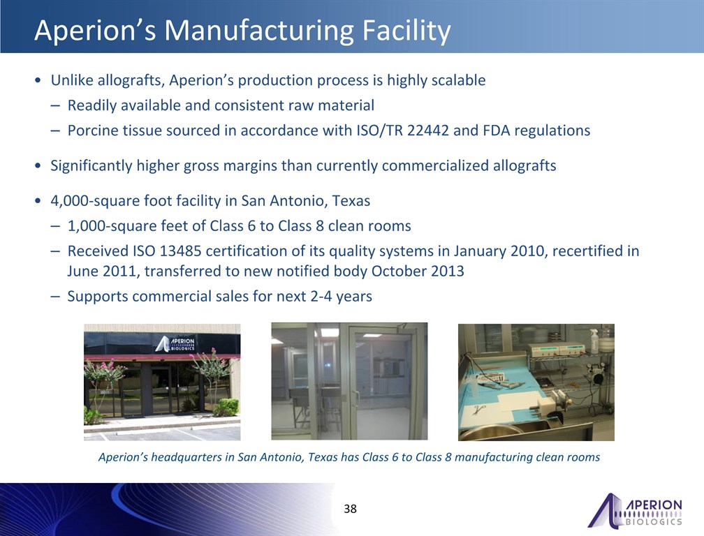 Aperion’s Manufacturing Facility  *  Unlike allografts, Aperion’s production process is highly scalableReadily available and consistent raw materialPorcine tissue sourced in accordance with ISO/TR 22442 and FDA regulationsSignificantly higher gross margins than currently commercialized allografts4,000-square foot facility in San Antonio, Texas1,000-square feet of Class 6 to Class 8 clean roomsReceived ISO 13485 certification of its quality systems in January 2010, recertified in June 2011, transferred to new notified body October 2013Supports commercial sales for next 2-4 years   Aperion’s headquarters in San Antonio, Texas has Class 6 to Class 8 manufacturing clean rooms
