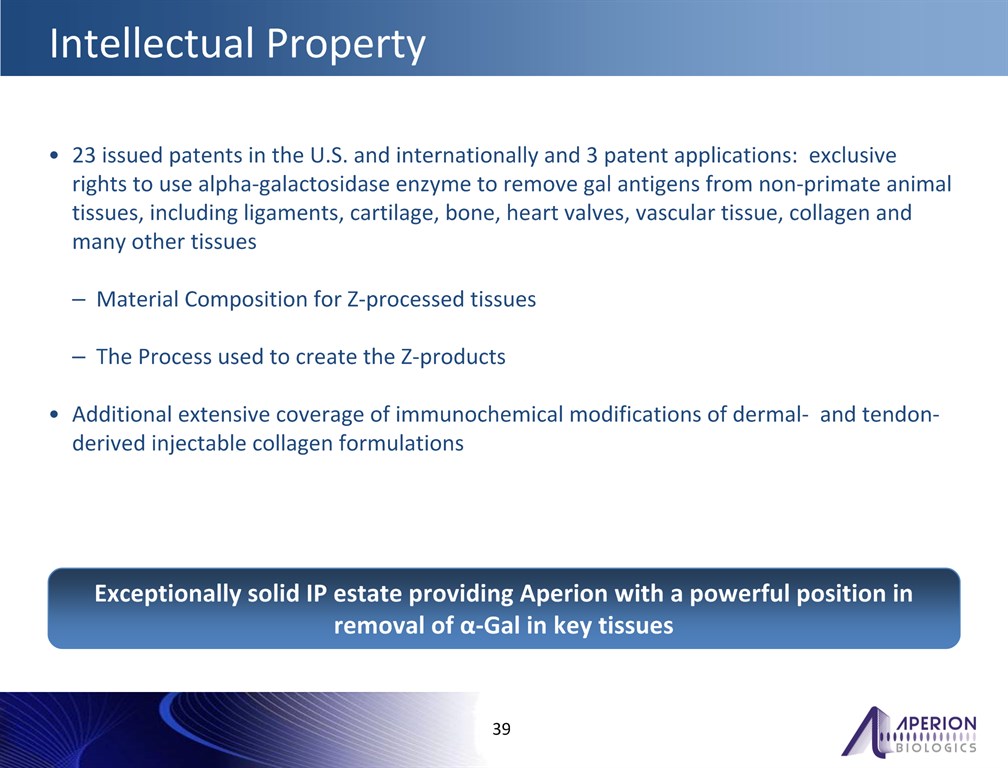 Intellectual Property  *  23 issued patents in the U.S. and internationally and 3 patent applications: exclusive rights to use alpha-galactosidase enzyme to remove gal antigens from non-primate animal tissues, including ligaments, cartilage, bone, heart valves, vascular tissue, collagen and many other tissuesMaterial Composition for Z-processed tissuesThe Process used to create the Z-productsAdditional extensive coverage of immunochemical modifications of dermal- and tendon-derived injectable collagen formulations  Exceptionally solid IP estate providing Aperion with a powerful position in removal of α-Gal in key tissues