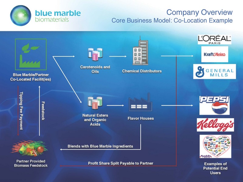 How do we move these products out to the marketplace? We have several different business models that we use but the primary business model we use is what we call our co-location example. And I won't go over this in too much detail – it's pretty self-explanatory – but we partner with companies that have low-value biomass streams. To date we've tested over 4,000 different biomass streams – things such as wood waste from the forestry industry; agricultural waste from farmers; as well as spent coffee grounds, tea leaves, fruit pumice, vegetable pumice, way streams from the cheese manufacturing and dairy manufacturing industries – and we partner with these partners – or we work with the partners – and we pay them a tipping fee payment.