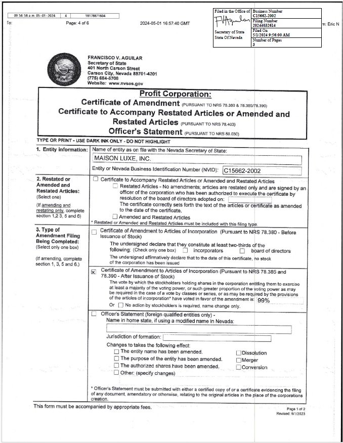 0001683168-24-004343.txt : 20240620 0001683168-24-004343.hdr.sgml : 20240620 20240620060608 ACCESSION NUMBER: 0001683168-24-004343 CONFORMED SUBMISSION TYPE: 1-A/A PUBLIC DOCUMENT COUNT: 17 FILED AS OF DATE: 20240620 DATE AS OF CHANGE: 20240620 FILER: COMPANY DATA: COMPANY CONFORMED NAME: Maison Luxe, Inc. CENTRAL INDEX KEY: 0001486452 STANDARD INDUSTRIAL CLASSIFICATION: SERVICES-AUTOMOTIVE REPAIR, SERVICES & PARKING [7500] ORGANIZATION NAME: 07 Trade & Services IRS NUMBER: 431965656 STATE OF INCORPORATION: NV FISCAL YEAR END: 0331 FILING VALUES: FORM TYPE: 1-A/A SEC ACT: 1933 Act SEC FILE NUMBER: 024-12409 FILM NUMBER: 241053965 BUSINESS ADDRESS: STREET 1: 4221 92ND COURT CITY: DES MOINES STATE: IA ZIP: 50322 BUSINESS PHONE: 515-331-6509 MAIL ADDRESS: STREET 1: 4221 92ND COURT CITY: DES MOINES STATE: IA ZIP: 50322 FORMER COMPANY: FORMER CONFORMED NAME: Clikia Corp. DATE OF NAME CHANGE: 20171030 FORMER COMPANY: FORMER CONFORMED NAME: MK Automotive, Inc. DATE OF NAME CHANGE: 20100308 1-A/A 1 primary_doc.xml 1-A/A LIVE 0001486452 XXXXXXXX 024-12409 true Maison Luxe, Inc. NV 2002 0001486452 3911 43-1965656 1 0 1 Bridge Plaza 2nd Floor Fort Lee NJ 07024 551-486-3980 Eric Newlan Other 51973.00 200000.00 266589.00 0.00 1021994.00 923926.00 0.00 2681770.00 -1659776.00 1021994.00 6274232.00 6320886.00 12500.00 1264126.00 0.01 0.01 N/A Common Stock 121153403 56066P107 OTC PINK Series A Preferred 2000000 000000N/A N/A N/A 0 000000N/A N/A true true Tier1 Unaudited Equity (common or preferred stock) Y N Y Y N N 500000000 229966409 0.0030 1500000.00 0.00 95400.00 0.00 1595400.00 Newlan Law Firm, PLLC 5000.00 State Regulators 2500.00 1683300.00 true CO CT DE FL GA NY PR Maison Luxe, Inc. COMMON STOCK 31800000 0 $95,400; offering terms determined by the board of directors Maison Luxe, Inc. COMMON STOCK 38000000 0 $35,000 for debt conversions; determination of the board of directors Regulation A or Securities Act Section 4(a)(2) PART II AND III 2 maison_1aa1.htm PART II AND III