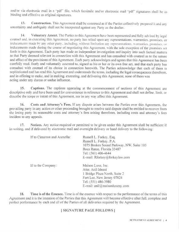 THIS AGREEMENT, effective the 1st day of May 2022, by Maison Luxe, Inc. with its principal place of business at 1 Bridge Plaza North Suite 2 Fort Lee, NJ 07024 ("Company"), and Raj Idnani, whose address is 121 Madison Avenue #3J New York, NY 10016 ("Executive").