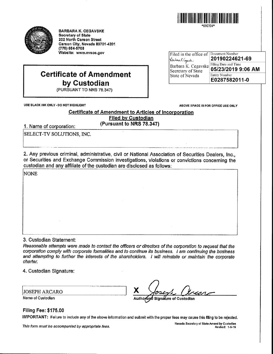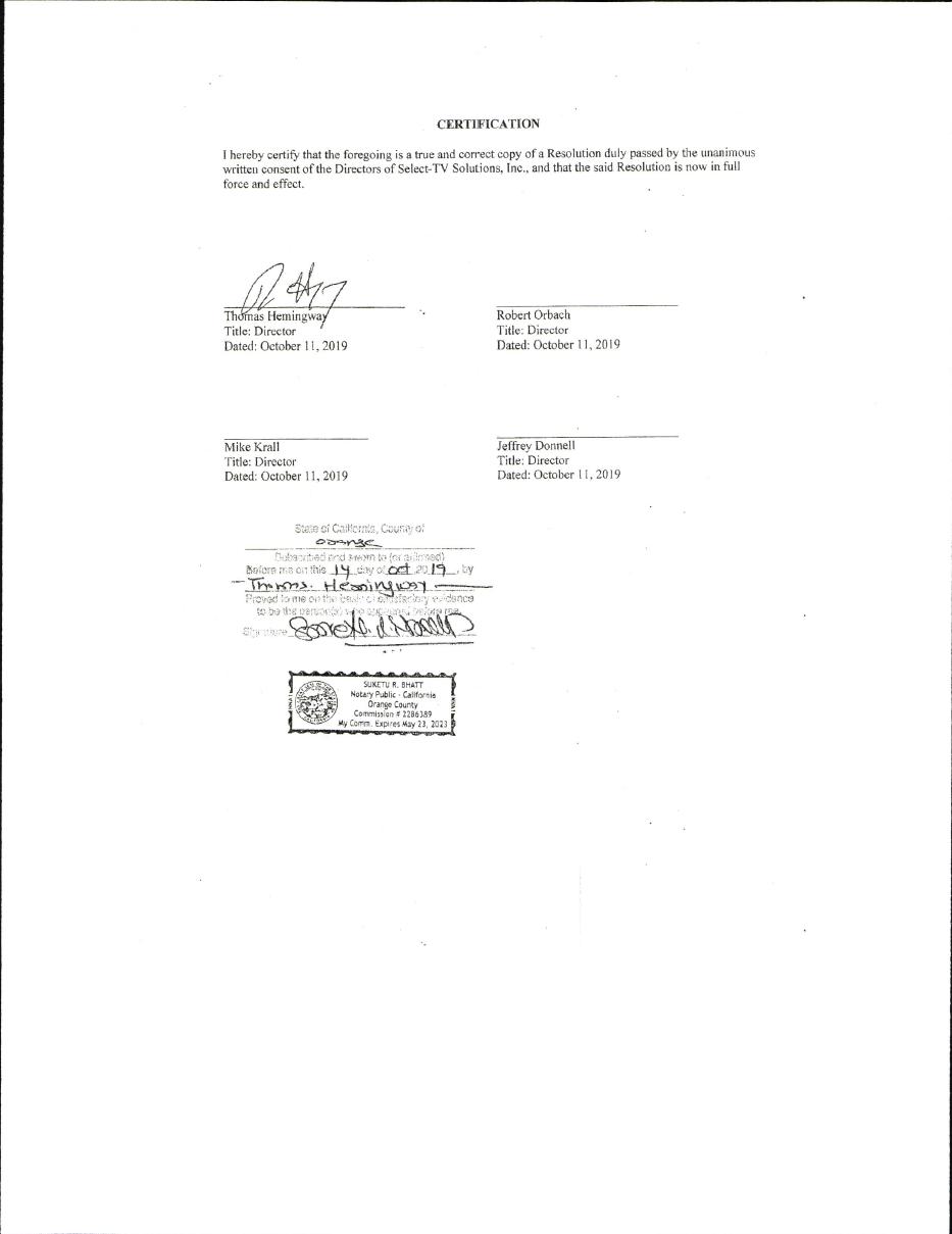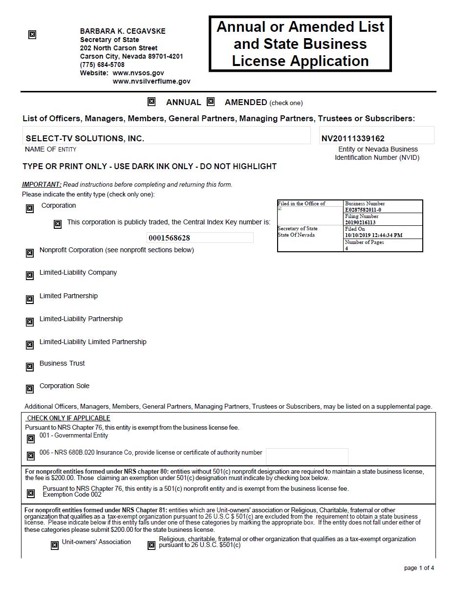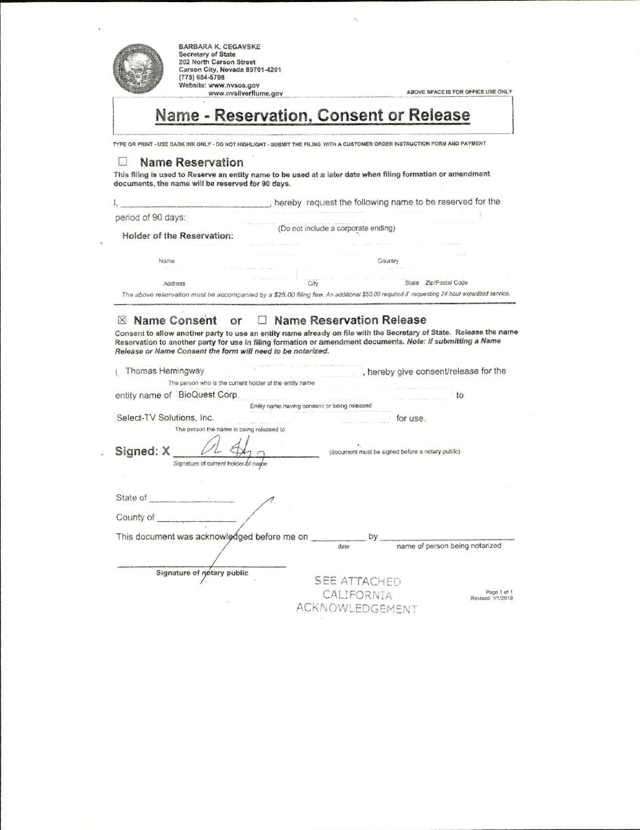 BioQuest Corp. the Company was originally incorporated on May 17, 2011 in the state of Nevada as Sedition Films, Inc. In June 2014, the Company changed its name to Select-Tv Solutions, Inc. In November 2019 the Company changed its name to BioQuest Corp., in order to reflect its current business and strategy. BioQuest, Corporation - markets, packages and distributes Hemp-CBD based products. Our mission is to Create High End, Products and aggregate all relevant CBD content in the Nutraceutical markets. In addition, BioQuest is positioned to generate revenue by acquiring established companies who have a current presence in the nutraceutical CBD industry and bring new products to the market generating immediate revenues, created and marketed by BioQuest.
