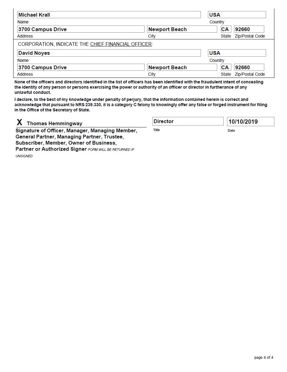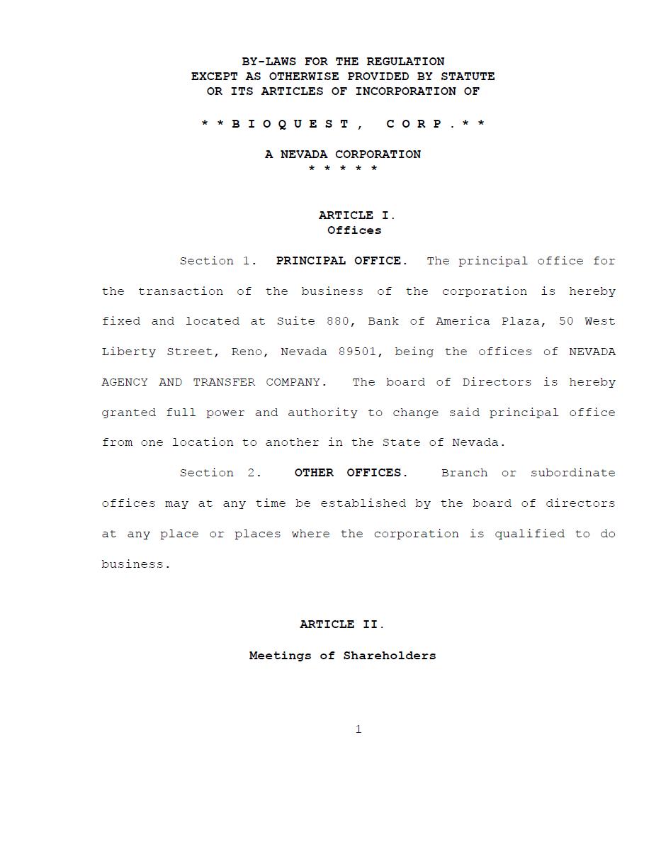 0001493152-20-001924.txt : 20200211 0001493152-20-001924.hdr.sgml : 20200211 20200211121952 ACCESSION NUMBER: 0001493152-20-001924 CONFORMED SUBMISSION TYPE: 1-A PUBLIC DOCUMENT COUNT: 68 FILED AS OF DATE: 20200211 DATE AS OF CHANGE: 20200211 FILER: COMPANY DATA: COMPANY CONFORMED NAME: Bioquest Corp CENTRAL INDEX KEY: 0001568628 STANDARD INDUSTRIAL CLASSIFICATION: CABLE & OTHER PAY TELEVISION SERVICES [4841] IRS NUMBER: 990378854 STATE OF INCORPORATION: NV FISCAL YEAR END: 0430 FILING VALUES: FORM TYPE: 1-A SEC ACT: 1933 Act SEC FILE NUMBER: 024-11151 FILM NUMBER: 20595439 BUSINESS ADDRESS: STREET 1: 1395 BRICKELL AVENUE STREET 2: SUITE 800 CITY: MIAMI STATE: FL ZIP: 33131 BUSINESS PHONE: 418-264-7134 MAIL ADDRESS: STREET 1: 1395 BRICKELL AVENUE STREET 2: SUITE 800 CITY: MIAMI STATE: FL ZIP: 33131 FORMER COMPANY: FORMER CONFORMED NAME: Select-TV Solutions, Inc. DATE OF NAME CHANGE: 20140626 FORMER COMPANY: FORMER CONFORMED NAME: Sedition Films, Inc. DATE OF NAME CHANGE: 20130201 1-A 1 primary_doc.xml 1-A LIVE 0001568628 XXXXXXXX true false Bioquest Corp NV 2011 0001568628 4841 99-0378854 0 0 3700 Campus Drive Suite 206 Newport Beach CA 92660 7149784425 Andrew Coldicutt, Esq. Other 0.00 0.00 0.00 0.00 0.00 11706.00 0.00 11706.00 -11706.00 0.00 0.00 0.00 0.00 -29886.00 -0.23 -0.23 n/a Common Stock, $.001 par value 8044233 09076H102 OTC Markets None 0 000000000 None None 0 000000000 None true true false Tier1 Unaudited Equity (common or preferred stock) Y N N Y N N 500000 8044233 2.0000 1000000.00 0.00 0.00 0.00 1000000.00 Andrew Coldicutt, Esq. 15000.00 Various States 3000.00 970000.00 true false CA CO CT DE FL IA MA MI NV NJ NY RI TX WA false BioQuest Corp. Common Stock 8044233 0 217,194,291 Exempt from registration under Section 4(2) of the Securities Act , as Amended, and the Rules promulgated thereunder. PART II AND III 2 partiiandiii.htm
