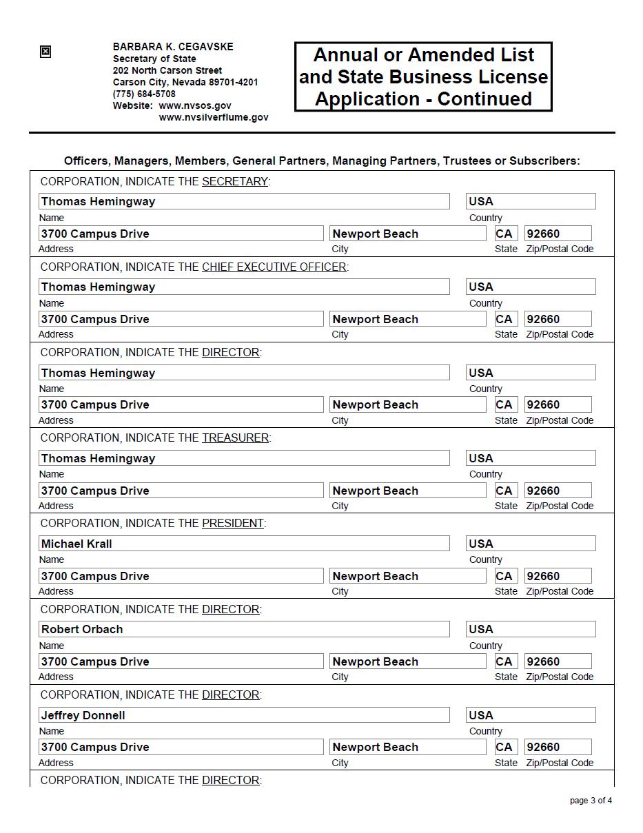 0001493152-20-006079.txt : 20200409 0001493152-20-006079.hdr.sgml : 20200409 20200408195158 ACCESSION NUMBER: 0001493152-20-006079 CONFORMED SUBMISSION TYPE: 1-A/A PUBLIC DOCUMENT COUNT: 73 FILED AS OF DATE: 20200409 DATE AS OF CHANGE: 20200408 FILER: COMPANY DATA: COMPANY CONFORMED NAME: Bioquest Corp CENTRAL INDEX KEY: 0001568628 STANDARD INDUSTRIAL CLASSIFICATION: CABLE & OTHER PAY TELEVISION SERVICES [4841] IRS NUMBER: 990378854 STATE OF INCORPORATION: NV FISCAL YEAR END: 0430 FILING VALUES: FORM TYPE: 1-A/A SEC ACT: 1933 Act SEC FILE NUMBER: 024-11151 FILM NUMBER: 20782922 BUSINESS ADDRESS: STREET 1: 1395 BRICKELL AVENUE STREET 2: SUITE 800 CITY: MIAMI STATE: FL ZIP: 33131 BUSINESS PHONE: 418-264-7134 MAIL ADDRESS: STREET 1: 1395 BRICKELL AVENUE STREET 2: SUITE 800 CITY: MIAMI STATE: FL ZIP: 33131 FORMER COMPANY: FORMER CONFORMED NAME: Select-TV Solutions, Inc. DATE OF NAME CHANGE: 20140626 FORMER COMPANY: FORMER CONFORMED NAME: Sedition Films, Inc. DATE OF NAME CHANGE: 20130201 1-A/A 1 primary_doc.xml 1-A/A LIVE 0001568628 XXXXXXXX 024-11151 true true Bioquest Corp NV 2011 0001568628 4841 99-0378854 0 0 3700 Campus Drive Suite 206 Newport Beach CA 92660 7149784425 Andrew Coldicutt, Esq. Other 34727.00 0.00 0.00 0.00 34727.00 6430.00 35000.00 41430.00 6703.00 34727.00 0.00 0.00 0.00 -241153.00 -0.09 -0.09 n/a Common Stock, $.001 par value 8044233 09076H102 OTC Markets None 0 000000000 None Debt Securities 35000 000000000 Convertible Note Payable true true Tier1 Unaudited Equity (common or preferred stock) Y N N Y N N 500000 8044233 2.0000 1000000.00 0.00 0.00 0.00 1000000.00 Andrew Coldicutt, Esq. 15000.00 Various States 3000.00 970000.00 true CA CO CT DE FL IA MA MI NV NJ NY RI TX WA BioQuest Corp. Common Stock 7807000 0 152,320 Exempt from registration under Section 4(2) of the Securities Act , as Amended, and the Rules promulgated thereunder. PART II AND III 2 partiiandiii.htm