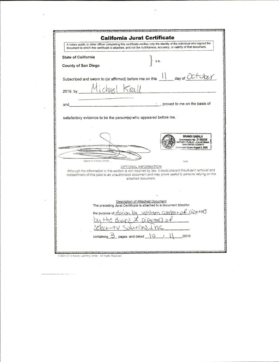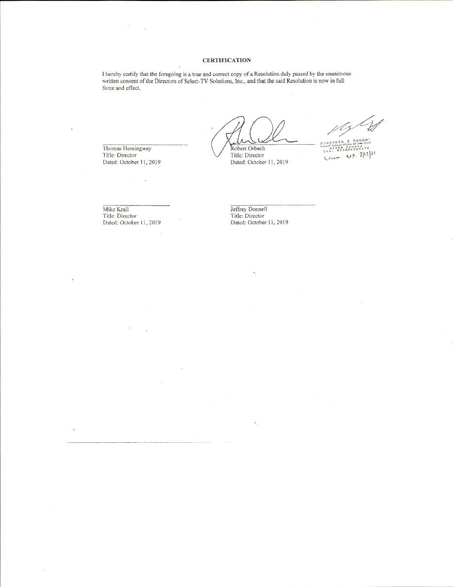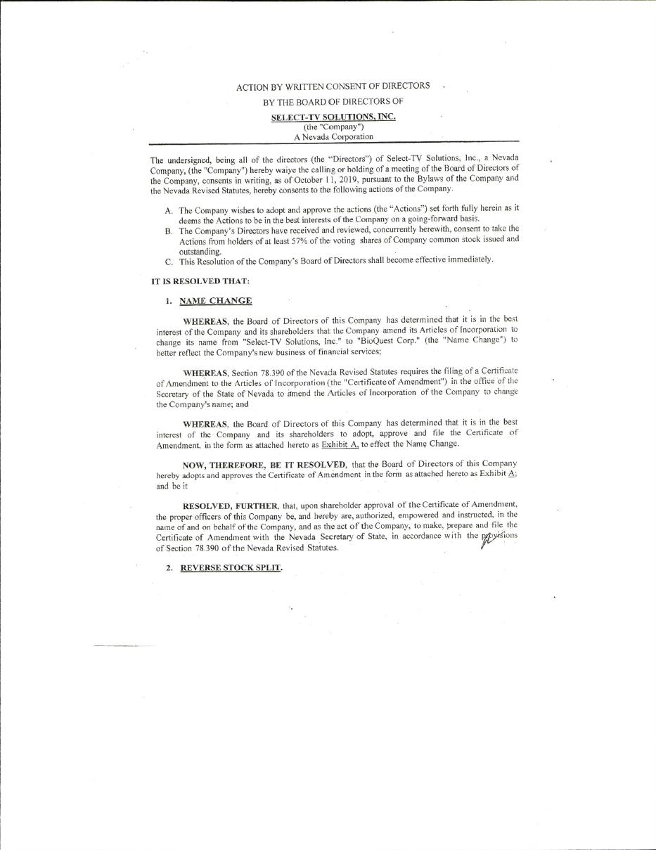 BioQuest Corp. the Company was originally incorporated on May 17, 2011 in the state of Nevada as Sedition Films, Inc. In June 2014, the Company changed its name to Select-Tv Solutions, Inc. In November 2019 the Company changed its name to BioQuest Corp., in order to reflect its current business and strategy. BioQuest, Corporation – plans to market, package and distribute Hemp-CBD based products. Our mission is to Create High End, products and aggregate all relevant CBD content in the Nutraceutical markets. BioQuest will also be positioned to generate revenue by acquiring established companies who have a current presence in the nutraceutical cannabis industry if the opportunity presents itself and bring its products to the market generating immediate revenues, created and marketed by BioQuest.