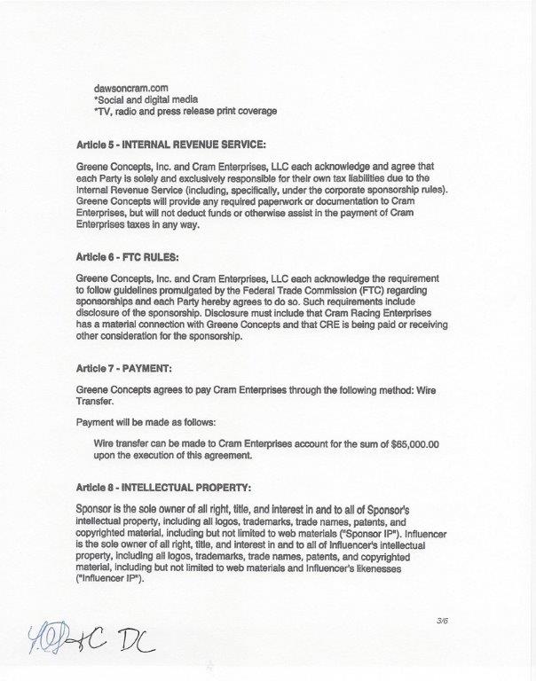 dawsoncram.com *Social and digital media *TV, radio and press release print coverage Article 5 - INTERNAL REVENUE SERVICE: Greene Concepts, Inc. and Cram Enterprises, LLC each acknowledge and agree that each Party is solely and exclusively responsible for their own tax liabilities due to the Internal Revenue Service (including, specifically, under the corporate sponsorship rules). Greene Concepts will provide any required paperwork or documentation to Cram Enterprises, but will not deduct funds or otherwise assist in the payment of Cram Enterprises taxes in any way. Article 6 • FTC RULES: Greene Concepts, Inc. and Cram Enterprises, LLC each acknowledge the requirement to follow guidelines promulgated by the Federal Trade Commission (FTC) regarding sponsorships and each Party hereby agrees to do so. Such requirements include disclosure of the sponsorship. Disclosure must include that Cram Racing Enterprises has a material connection with Greene Concepts and that CRE is being paid or receiving other consideration for the sponsorship. Artlcle 7 - PAYMENT: Greene Concepts agrees to pay Cram Enterprises through the following method: Wire Transfer. Payment will be made as follows: Wire transfer can be made to Cram Enterprises account for the sum of $25,000.00 upon the execution of this agreement. Artlcle 8 - INTELLECTUAL PROPERTY: Sponsor is the sole owner of all right, title, and interest in and to all of Sponsor's intellectual property, including all logos, trademarks, trade names, patents, and copyrighted material, including but not limited to web materials ("Sponsor IP"). Influencer is the sole owner of all right, title, and interest in and to all of Influencer's intellectual property, including all logos, trademarks, trade names, patents, and copyrighted material, including but not limited to web materials and Influencer's likenesses ("Influencer IP"). 3 /6