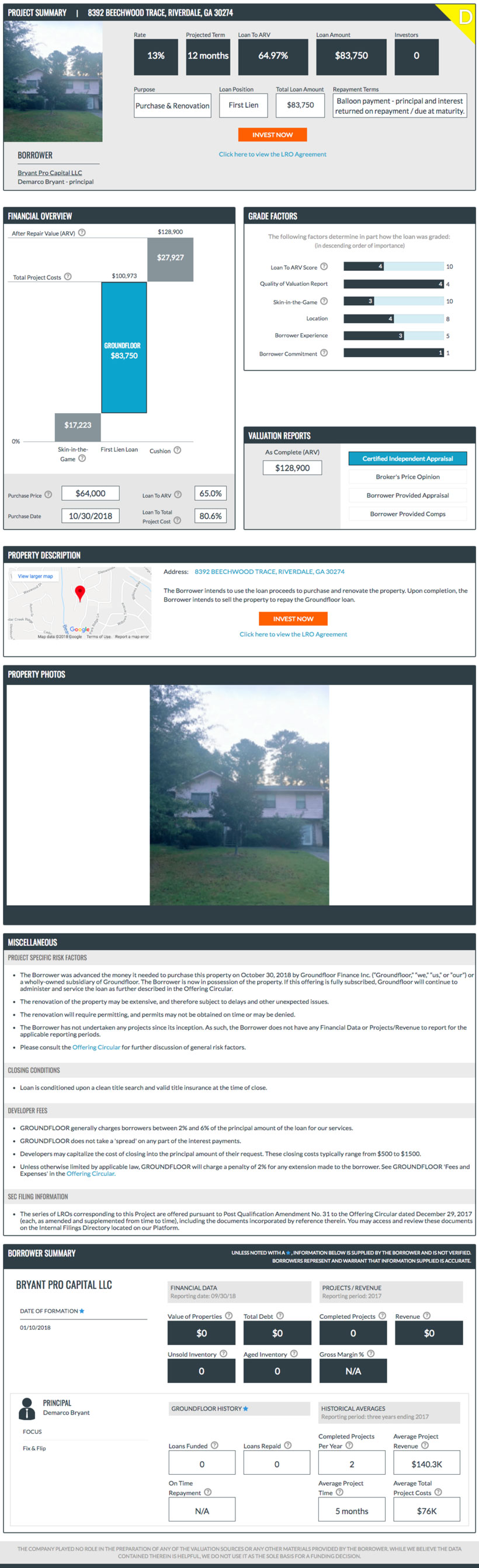 PROJECT SUMMARY | 8392 BEECHWOOD TRACE, RIVERDALE, GA 30274 D Rate Projected Term Loan To ARV Loan Amount Investors 13% 12 months 64.97% $83,750 0 Purpose Loan Position Total Loan Amount Repayment Terms Purchase & Renovation First Lien $83,750 Balloon payment - principal and interest returned on repayment / due at maturity. BORROWER Bryant Pro Capital LLC Demarco Bryant - principal INVEST NOW Click here to view the LRO Agreement FINANCIAL OVERVIEW After Repair Value (ARV) $128,900 $27,927 Total Project Costs $100,973 GROUNDFLOOR $83,750 $17,223 0% Skin-in-the-Game First Lien Loan Cushion Purchase Price $64,000 Loan To ARV 65.0% Purchase Date 10/30/2018 Loan To Total Project Cost 80.6% GRADE FACTORS The following factors determine in part how the loan was graded: (in descending order of importance) Loan To ARV Score 4 10 Quality of Valuation Report 4 4 Skin-in-the-Game 3 10 Location 4 8 Borrower Experience 3 5 Borrower Commitment 1 1 VALUATION REPORTS As Complete (ARV) $128,900 Certified Independent Appraisal Broker’s Price Opinion Borrower Provided Appraisal Borrower Provided Comps PROPERTY DESCRIPTION Address: 8392 BEECHWOOD TRACE, RIVERDALE, GA 30274 The Borrower intends to use the loan proceeds to purchase and renovate the property. Upon completion, the Borrower intends to sell the property to repay the Groundfloor loan. INVEST NOW Click here to view the LRO Agreement PROPERTY PHOTOS MISCELLANEOUS PROJECT SPECIFIC RISK FACTORS The Borrower was advanced the money it needed to purchase this property on October 30, 2018 by Groundfloor Finance Inc. (“Groundfloor,” “we,” “us,” or “our”) or a wholly-owned subsidiary of Groundfloor. The Borrower has now in possession of the property. If this offering is fully subscribed, Groundfloor will continue to administer and service the loan as further described in the Offering Circular. The renovation of the property may be extensive, and therefore subject to delays and other unexpected issues. The renovation will require permitting, and permits may not be obtained on time or may be denied. The Borrower has not undertaken any project since its inception. As such, the Borrower does not have any Financial Data or Projects/Revenue to report for the applicable reporting periods. Please consult the Offering Circular for further discussion of general risk factors. CLOSING CONDITIONS Loan is conditioned upon a clean title search and valid title insurance at the time of close. DEVELOPER FEES GROUNDFLOOR generally charges borrowers between 2% and 6% of the principal amount of the loan for our services. GROUNDFLOOR does not take a ‘spread’ on any part of the interest payments. Developers may capitalize the cost of closing into the principal amount of their request. These closing costs typically range from $500 to $1500. Unless otherwise limited by applicable law, GROUNDFLOOR will charge a penalty of 2% for any extension made to the borrower. See GROUNDFLOOR ‘Fees and Expenses’ in the Offering Circular. SEC FILING INFORMATION The series of LROs corresponding to this Project are offered pursuant to Post Qualification Amendment No.31 to the Offering Circular dated December 29, 2017 (each, as amended and supplemented from time to time), including the documents incorporated by reference therein. You may access and review these documents on the Internal Filings Directory located on our Platform. BORROWER SUMMARY UNLESS NOTED WITH A*, INFORMATION BELOW IS SUPPLIED BY THE BORROWER AND IS NOT VERIFIED. BORROWERS REPRESENT AND WARRANT THAT INFORMATION SUPPLIED IS ACCURATE. BRYANT PRO CAPITAL LLC DATE OF FORMATION* 01/10/2018 FINANCIAL DATA PROJECTS / REVENUE Reporting date: 09/30/18 Reporting period: 2017 Value of Properties Total Debt Completed Projects Revenue $0 $0 0 $0 Unsold Inventory Aged Inventory Gross Margin% 0 0 N/A PRINCIPAL Demarco Bryant FOCUS Fix & Flip GROUNDFLOOR HISTORY * HISTORICAL AVERAGES Reporting period: three years ending 2017 Loans Funded Loans Repaid Completed Projects Per Year Average Project Revenue 0 0 2 $140.3K On Time Repayment Average Project Time Average Total Project Costs N/A 5 months $76K THE COMPANY PLAYED NO ROLE IN THE PREPARATION OF ANY OF THE VALUATION SOURCES OR ANY OTHER MATERIALS PROVIDED BY THE BORROWER. WHILE WE BELIEVE THE DATA CONTAINED THEREIN IS HELPFUL, WE DO NOT USE IT AS THE SOLE BASIS FOR A FUNDING DECISION.