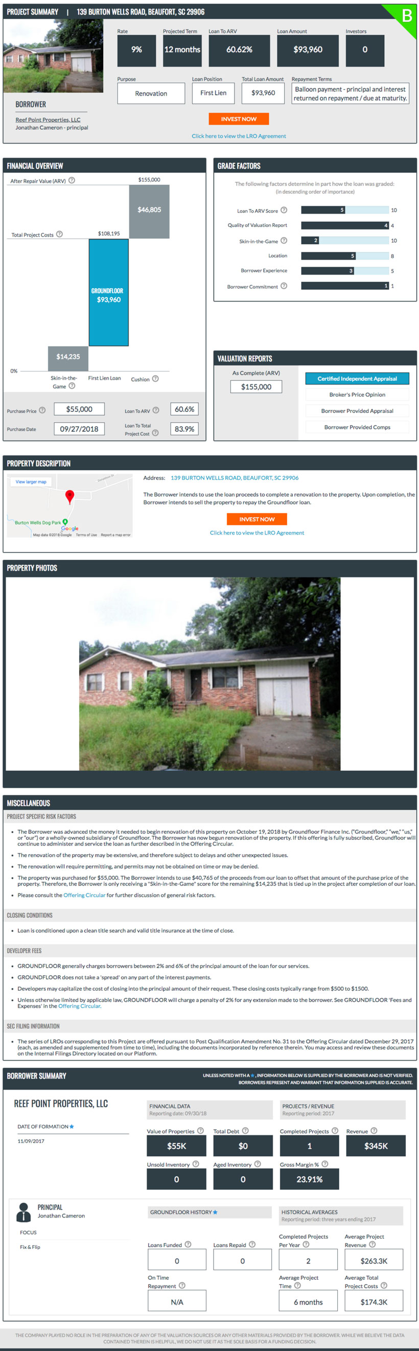 PROJECT SUMMARY | 139 BURTON WELLS ROAD, BEAUFORT, SC 29906 B Rate Projected Term Loan To ARV Loan Amount Investors 9% 12 months 60.62% $93,960 0 Purpose Loan Position Total Loan Amount Repayment Terms Renovation First Lien $93,960 Balloon payment - principal and interest returned on repayment / due at maturity. BORROWER Reef Point Properties, LLC Jonathan Cameron - principal INVEST NOW Click here to view the LRO Agreement FINANCIAL OVERVIEW After Repair Value (ARV) $155,000 $46,805 Total Project Costs $108,195 GROUNDFLOOR $93,960 $14,235 0% Skin-in-the-Game First Lien Loan Cushion Purchase Price $55,000 Loan To ARV 60.6% Purchase Date 09/27/2018 Loan To Total Project Cost 83.9% GRADE FACTORS The following factors determine in part how the loan was graded: (in descending order of importance) Loan To ARV Score 5 10 Quality of Valuation Report 4 4 Skin-in-the-Game 2 10 Location 5 8 Borrower Experience 3 5 Borrower Commitment 1 1 VALUATION REPORTS As Complete (ARV) $155,000 Certified Independent Appraisal Broker’s Price Opinion Borrower Provided Appraisal Borrower Provided Comps PROPERTY DESCRIPTION Address: 139 BURTON WELLS ROAD, BEAUFORT, SC 29906 The Borrower intends to use the loan proceeds to complete a renovation to the property. Upon completion, the Borrower intends to sell the property to repay the Groundfloor loan. INVEST NOW Click here to view the LRO Agreement PROPERTY PHOTOS MISCELLANEOUS PROJECT SPECIFIC RISK FACTORS The Borrower was advanced the money it needed to begin renovation of this property on October 19, 2018 by Groundfloor Finance Inc. (“Groundfloor,” “we,” “us,” or “our”) or a wholly-owned subsidiary of Groundfloor. The Borrower has now begun renovation of the property. If this offering is fully subscribed, Groundfloor will continue to administer and service the loan as further described in the Offering Circular. The renovation of the property may be extensive, and therefore subject to delays and other unexpected issues. The renovation will require permitting, and permits may not be obtained on time or may be denied. The Property was purchased for $55,000. The Borrower intends to use $40,765 of the proceeds from our loan to offset that amount of the purchase price of the property. Therefore, the Borrower is only receiving a “Skin-in-the-Game” score for the remaining $14,235 that is tied up in the project after completion of our loan. Please consult the Offering Circular for further discussion of general risk factors. CLOSING CONDITIONS Loan is conditioned upon a clean title search and valid title insurance at the time of close. DEVELOPER FEES GROUNDFLOOR generally charges borrowers between 2% and 6% of the principal amount of the loan for our services. GROUNDFLOOR does not take a ‘spread’ on any part of the interest payments. Developers may capitalize the cost of closing into the principal amount of their request. These closing costs typically range from $500 to $1500. Unless otherwise limited by applicable law, GROUNDFLOOR will charge a penalty of 2% for any extension made to the borrower. See GROUNDFLOOR ‘Fees and Expenses’ in the Offering Circular. SEC FILING INFORMATION The series of LROs corresponding to this Project are offered pursuant to Post Qualification Amendment No.31 to the Offering Circular dated December 29, 2017 (each, as amended and supplemented from time to time), including the documents incorporated by reference therein. You may access and review these documents on the Internal Filings Directory located on our Platform. BORROWER SUMMARY UNLESS NOTED WITH A*, INFORMATION BELOW IS SUPPLIED BY THE BORROWER AND IS NOT VERIFIED. BORROWERS REPRESENT AND WARRANT THAT INFORMATION SUPPLIED IS ACCURATE. REEF POINT PROPERTIES, LLC DATE OF FORMATION* 11/09/2017 FINANCIAL DATA PROJECTS / REVENUE Reporting date: 09/30/18 Reporting period: 2017 Value of Properties Total Debt Completed Projects Revenue $55K $0 1 $345K Unsold Inventory Aged Inventory Gross Margin% 0 0 23.91% PRINCIPAL Jonathan Cameron FOCUS Fix & Flip GROUNDFLOOR HISTORY * HISTORICAL AVERAGES Reporting period: three years ending 2017 Loans Funded Loans Repaid Completed Projects Per Year Average Project Revenue 0 0 2 $263.3K On Time Repayment Average Project Time Average Total Project Costs N/A 6 months $174.3K THE COMPANY PLAYED NO ROLE IN THE PREPARATION OF ANY OF THE VALUATION SOURCES OR ANY OTHER MATERIALS PROVIDED BY THE BORROWER. WHILE WE BELIEVE THE DATA CONTAINED THEREIN IS HELPFUL, WE DO NOT USE IT AS THE SOLE BASIS FOR A FUNDING DECISION.