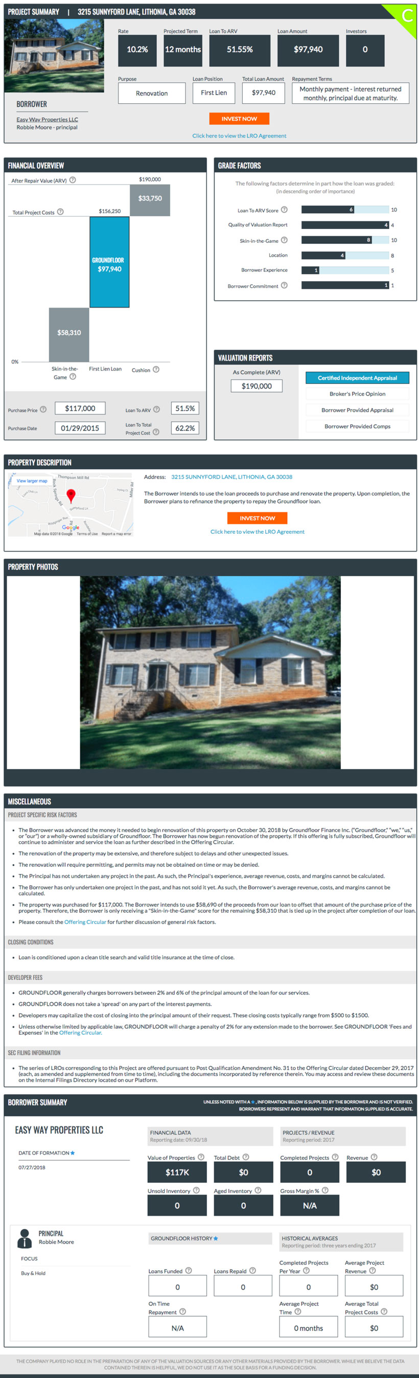 PROJECT SUMMARY | 3215 SUNNYFORD LANE, LITHONIA, GA 30038 C Rate Projected Term Loan To ARV Loan Amount Investors 10.2% 12 months 51.55% $97,940 0 Purpose Loan Position Total Loan Amount Repayment Terms Renovation First Lien $97,940 Monthly payment - interest returned monthly, principal due at maturity. BORROWER Easy Way Properties LLC Robbie Moore - principal INVEST NOW Click here to view the LRO Agreement FINANCIAL OVERVIEW After Repair Value (ARV) $190,000 $33,750 Total Project Costs $156,250 GROUNDFLOOR $97,940 $58,310 0% Skin-in-the-Game First Lien Loan Cushion Purchase Price $117,000 Loan To ARV 51.5% Purchase Date 01/29/2015 Loan To Total Project Cost 62.2% GRADE FACTORS The following factors determine in part how the loan was graded: (in descending order of importance) Loan To ARV Score 6 10 Quality of Valuation Report 4 4 Skin-in-the-Game 8 10 Location 4 8 Borrower Experience 1 5 Borrower Commitment 1 1 VALUATION REPORTS As Complete (ARV) $190,000 Certified Independent Appraisal Broker’s Price Opinion Borrower Provided Appraisal Borrower Provided Comps PROPERTY DESCRIPTION Address: 3215 SUNNYFORD LANE, LITHONIA, GA 30038 The Borrower intends to use the loan proceeds to purchase and renovate the property. Upon completion, the Borrower plans to refinance the property to repay the Groundfloor loan. INVEST NOW Click here to view the LRO Agreement PROPERTY PHOTOS MISCELLANEOUS PROJECT SPECIFIC RISK FACTORS The Borrower was advanced the money it needed to begin renovation of this property on October 30, 2018 by Groundfloor Finance Inc. (“Groundfloor,” “we,” “us,” or “our”) or a wholly-owned subsidiary of Groundfloor. The Borrower has now begun renovation of the property. If this offering is fully subscribed, Groundfloor will continue to administer and service the loan as further described in the Offering Circular. The renovation of the property may be extensive, and therefore subject to delays and other unexpected issues. The renovation will require permitting, and permits may not be obtained on time or may be denied. The Principal has not undertaken any project in the past. As such, the Principal’s experience, average revenue, costs, and margins connot be calculated. The Borrower has only undertaken one project in the past, and has not sold it yet. As such, the Borrower’s average revenue, costs, and margins cannot be calculated. The Property was purchased for $117,000. The Borrower intends to use $58,690 of the proceeds from our loan to offset that amount of the purchase price of the property. Therefore, the Borrower is only receiving a “Skin-in-the-Game” score for the remaining $58,310 that is tied up in the project after completion of our loan. Please consult the Offering Circular for further discussion of general risk factors. CLOSING CONDITIONS Loan is conditioned upon a clean title search and valid title insurance at the time of close. DEVELOPER FEES GROUNDFLOOR generally charges borrowers between 2% and 6% of the principal amount of the loan for our services. GROUNDFLOOR does not take a ‘spread’ on any part of the interest payments. Developers may capitalize the cost of closing into the principal amount of their request. These closing costs typically range from $500 to $1500. Unless otherwise limited by applicable law, GROUNDFLOOR will charge a penalty of 2% for any extension made to the borrower. See GROUNDFLOOR ‘Fees and Expenses’ in the Offering Circular. SEC FILING INFORMATION The series of LROs corresponding to this Project are offered pursuant to Post Qualification Amendment No. 31 to the Offering Circular dated December 29, 2017 (each, as amended and supplemented from time to time), including the documents incorporated by reference therein. You may access and review these documents on the Internal Filings Directory located on our Platform. BORROWER SUMMARY UNLESS NOTED WITH A*, INFORMATION BELOW IS SUPPLIED BY THE BORROWER AND IS NOT VERIFIED. BORROWERS REPRESENT AND WARRANT THAT INFORMATION SUPPLIED IS ACCURATE. EASY WAY PROPERTIES LLC DATE OF FORMATION* 07/27/2018 FINANCIAL DATA PROJECTS / REVENUE Reporting date: 09/30/18 Reporting period: 2017 Value of Properties Total Debt Completed Projects Revenue $117K $0 0 $0 Unsold Inventory Aged Inventory Gross Margin% 0 0 N/A PRINCIPAL Robbie Moore FOCUS Buy & Hold GROUNDFLOOR HISTORY * HISTORICAL AVERAGES Reporting period: three years ending 2017 Loans Funded Loans Repaid Completed Projects Per Year Average Project Revenue 0 0 0 $0 On Time Repayment Average Project Time Average Total Project Costs N/A 0 months $0 THE COMPANY PLAYED NO ROLE IN THE PREPARATION OF ANY OF THE VALUATION SOURCES OR ANY OTHER MATERIALS PROVIDED BY THE BORROWER. WHILE WE BELIEVE THE DATA CONTAINED THEREIN IS HELPFUL, WE DO NOT USE IT AS THE SOLE BASIS FOR A FUNDING DECISION.