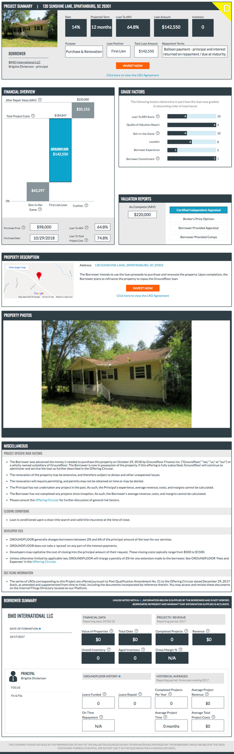 PROJECT SUMMARY | 130 SUNSHINE LANE, SPARTANBURG, SC 29301 D Rate Projected Term Loan to ARV Loan Amount Investors 14% 12 months 64.8% $142,550 0 Purpose Loan Position Total Loan Amount Repayment Terms Purchase & Renovation First Lien $142,550 Balloon payment - principal and interest returned on repayment / due at maturity. BORROWER BMD International LLC Brigitte Dickerson - principal INVEST NOW Click here to view the LRO Agreement FINANCIAL OVERVIEW After Repair Value (ARV) $220,000 $35,153 Total Project Costs $184,847 GROUNDFLOOR $142,550 $42,297 0% Skin-in-the-Game First Lien Loan Cushion Purchase Price $98,000 Loan To ARV 64.8% Purchase Date 10/29/2018 Loan To Total Project Cost 74.8% GRADE FACTORS The following factors determine in part how the loan was graded: (in descending order of importance) Loan To ARV Score 4 10 Quality of Valuation Report 4 4 Skin-in-the-Game 4 10 Location 4 8 Borrower Experience 1 5 Borrower Commitment 1 1 VALUATION REPORTS As Complete (ARV) $220,000 Certified Independent Appraisal Broker’s Price Opinion Borrower Provided Appraisal Borrower Provided Comps PROPERTY DESCRIPTION Address: 130 SUNSHINE LANE, SPARTANBURG, SC 29301 The Borrower intends to use the loan proceeds to purchase and renovate the property. Upon completion, the Borrower plans to refinance the property to repay the Groundfloor loan. INVEST NOW Click here to view the LRO Agreement PROPERTY PHOTOS MISCELLANEOUS PROJECT SPECIFIC RISK FACTORS The Borrower was advanced the money it needed to purchase of this property on October 29, 2018 by Groundfloor Finance Inc. (“Groundfloor,” “we,” “us,” or, “our,”) or a wholly-owned subsidiary of Groundfloor. The Borrower is now in possession of the property. If this offering is fully subscribed, Groundfloor will continue to administer and service the loan as further described in the Offering Circular. The renovation of the property may be extensive, and therefore subject to delays and other unexpected issues. The renovation will require permitting, and permits may not be obtained on time or may be denied. The Principal has not undertaken any project in the past. As such, the Principal’s experience, average revenue, costs, and margins connot be calculated. The Borrower has not completed any project since inception. As such, the Borrower’s average revenue, costs, and margins cannot be calculated. Please consult the Offering Circular for further discussion of general risk factors. CLOSING CONDITIONS Loan is conditioned upon a clean title search and valid title insurance at the time of close. DEVELOPER FEES GROUNDFLOOR generally charges borrowers between 2% and 6% of the principal amount of the loan for our services. GROUNDFLOOR does not take a ‘spread’ on any part of the interest payments. Developers may capitalize the cost of closing into the principal amount of their request. These closing costs typically range from $500 to $1500. Unless otherwise limited by applicable law, GROUNDFLOOR will charge a penalty of 2% for any extension made to the borrower. See GROUNDFLOOR ‘Fees and Expenses’ in the Offering Circular. SEC FILING INFORMATION The series of LROs corresponding to this Project are offered pursuant to Post Qualification Amendment No. 31 to the Offering Circular dated December 29, 2017 (each, as amended and supplemented from time to time), including the documents incorporated by reference therein. You may access and review these documents on the Internal Filings Directory located on our Platform. BORROWER SUMMARY UNLESS NOTED WITH A*, INFORMATION BELOW IS SUPPLIED BY THE BORROWER AND IS NOT VERIFIED. BORROWERS REPRESENT AND WARRANT THAT INFORMATION SUPPLIED IS ACCURATE. BMD INTERNATIONAL LLC DATE OF FORMATION* 10/17/2017 FINANCIAL DATA PROJECTS / REVENUE Reporting date: 09/30/18 Reporting period: 2017 Value of Properties Total Debt Completed Projects Revenue $0 $0 0 $0 Unsold Inventory Aged Inventory Gross Margin% 0 0 N/A PRINCIPAL Brigitte Dickerson FOCUS Fix & Flip GROUNDFLOOR HISTORY * HISTORICAL AVERAGES Reporting period: three years ending 2017 Loans Funded Loans Repaid Completed Projects Per Year Average Project Revenue 0 0 0 $0 On Time Repayment Average Project Time Average Total Project Costs N/A 0 months $0 THE COMPANY PLAYED NO ROLE IN THE PREPARATION OF ANY OF THE VALUATION SOURCES OR ANY OTHER MATERIALS PROVIDED BY THE BORROWER. WHILE WE BELIEVE THE DATA CONTAINED THEREIN IS HELPFUL, WE DO NOT USE IT AS THE SOLE BASIS FOR A FUNDING DECISION.