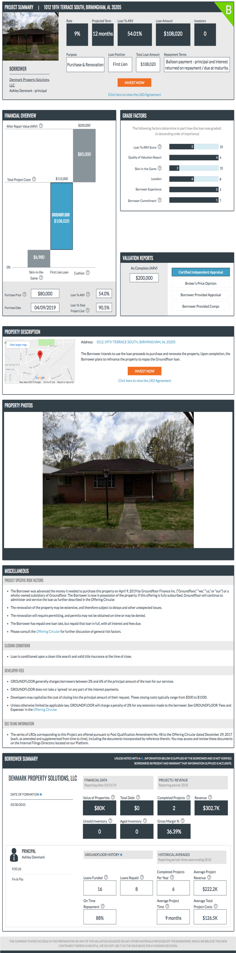 PROJECT SUMMARY | 1012 19TH TERRACE SOUTH, BIRMINGHAM, AL 35205 B Rate Projected Term Loan to ARV Loan Amount Investors 9% 12 months 54.01% $108,020 0 Purpose Loan Position Total Loan Amount Repayment Terms Purchase & Renovation First Lien $108,020 Balloon payment - principal and interest returned on repayment / due at maturity. BORROWER Denmark Property Solutions, LLC Ashley Denmark - principal INVEST NOW Click here to view the LRO Agreement FINANCIAL OVERVIEW After Repair Value (ARV) $200,000 $85,000 Total Project Costs $115,000 GROUNDFLOOR $108,020 $6,980 0% Skin-in-the-Game First Lien Loan Cushion Purchase Price $80,000 Loan To ARV 54.0% Purchase Date 04/09/2019 Loan To Total Project Cost 90.5% GRADE FACTORS The following factors determine in part how the loan was graded: (in descending order of importance) Loan To ARV Score 5 10 Quality of Valuation Report 4 4 Skin-in-the-Game 2 10 Location 4 8 Borrower Experience 5 5 Borrower Commitment 1 1 VALUATION REPORTS As Complete (ARV) $200,000 Certified Independent Appraisal Broker’s Price Opinion Borrower Provided Appraisal Borrower Provided Comps PROPERTY DESCRIPTION Address: 1012 19TH TERRACE SOUTH, BIRMINGHAM, AL 35205 The Borrower intends to use the loan proceeds to purchase and renovate the property. Upon completion, the Borrower plans to refinance the property to repay the Groundfloor loan. INVEST NOW Click here to view the LRO Agreement PROPERTY PHOTOS MISCELLANEOUS PROJECT SPECIFIC RISK FACTORS The Borrower was advanced the money it needed to purchase of this property on April 9, 2019 by Groundfloor Finance Inc. (“Groundfloor,” “we,” us,” or, “our,”) or a wholly-owned subsidiary of Groundfloor. The Borrower is now in possession of the property. If this offering is fully subscribed, Groundfloor will continue to administer and service the loan as further described in the Offering Circular. The renovation of the property may be extensive, and therefore subject to delays and other unexpected issues. The renovation will require permitting, and permits may not be obtained on time or may be denied. The Borrower has repaid one loan late, but repaid that loan in full, with all interest and fees due. Please consult the Offering Circular for further discussion of general risk factors. CLOSING CONDITIONS Loan is conditioned upon a clean title search and valid title insurance at the time of close. DEVELOPER FEES GROUNDFLOOR generally charges borrowers between 2% and 6% of the principal amount of the loan for our services. GROUNDFLOOR does not take a ‘spread’ on any part of the interest payments. Developers may capitalize the cost of closing into the principal amount of their request. These closing costs typically range from $500 to $1500. Unless otherwise limited by applicable law, GROUNDFLOOR will charge a penalty of 2% for any extension made to the borrower. See GROUNDFLOOR ‘Fees and Expenses’ in the Offering Circular. SEC FILING INFORMATION The series of LROs corresponding to this Project are offered pursuant to Post Qualification Amendment No. 48 to the Offering Circular dated December 29, 2017 (each, as amended and supplemented from time to time), including the documents incorporated by reference therein. You may access and review these documents on the Internal Filings Directory located on our Platform. BORROWER SUMMARY UNLESS NOTED WITH A*, INFORMATION BELOW IS SUPPLIED BY THE BORROWER AND IS NOT VERIFIED. BORROWERS REPRESENT AND WARRANT THAT INFORMATION SUPPLIED IS ACCURATE. DENMARK PROPERTY SOLUTIONS, LLC DATE OF FORMATION* 03/30/2015 FINANCIAL DATA PROJECTS / REVENUE Reporting date: 03/31/19 Reporting period: 2018 Value of Properties Total Debt Completed Projects Revenue $80k $0 2 $302.7K Unsold Inventory Aged Inventory Gross Margin% 0 0 36.39% PRINCIPAL Ashley Denmark FOCUS Fix & Flip GROUNDFLOOR HISTORY * HISTORICAL AVERAGES Reporting period: three years ending 2018 Loans Funded Loans Repaid Completed Projects Per Year Average Project Revenue 16 8 6 $222.2K On Time Repayment Average Project Time Average Total Project Costs 88% 9 months $126.6K THE COMPANY PLAYED NO ROLE IN THE PREPARATION OF ANY OF THE VALUATION SOURCES OR ANY OTHER MATERIALS PROVIDED BY THE BORROWER. WHILE WE BELIEVE THE DATA CONTAINED THEREIN IS HELPFUL, WE DO NOT USE IT AS THE SOLE BASIS FOR A FUNDING DECISION.