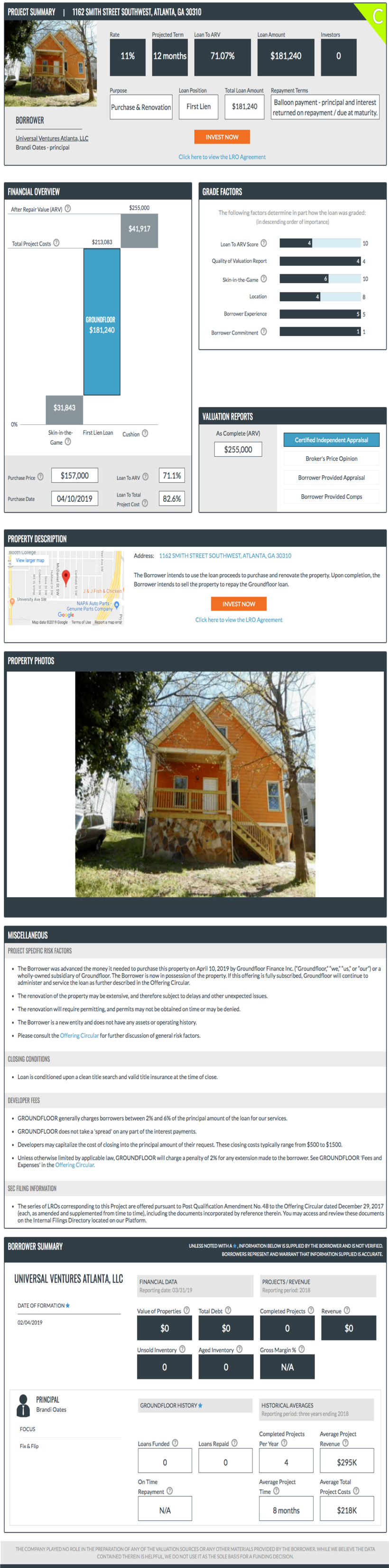 PROJECT SUMMARY | 1162 SMITH STREET SOUTHWEST, ATLANTA, GA 30310 C Rate Projected Term Loan to ARV Loan Amount Investors 11% 12 months 71.07% $181,240 0 Purpose Loan Position Total Loan Amount Repayment Terms Purchase & Renovation First Lien $181,240 Balloon payment - principal and interest returned on repayment / due at maturity. BORROWER Universal Ventures Atlanta, LLC Brandi Oates - principal INVEST NOW Click here to view the LRO Agreement FINANCIAL OVERVIEW After Repair Value (ARV) $255,000 $41,917 Total Project Costs $213,083 GROUNDFLOOR $181,240 $31,843 0% Skin-in-the-Game First Lien Loan Cushion Purchase Price $157,000 Loan To ARV 71.1% Purchase Date 04/10/2019 Loan To Total Project Cost 82.6% GRADE FACTORS The following factors determine in part how the loan was graded: (in descending order of importance) Loan To ARV Score 4 10 Quality of Valuation Report 4 4 Skin-in-the-Game 6 10 Location 4 8 Borrower Experience 5 5 Borrower Commitment 1 1 VALUATION REPORTS As Complete (ARV) $255,000 Certified Independent Appraisal Broker’s Price Opinion Borrower Provided Appraisal Borrower Provided Comps PROPERTY DESCRIPTION Address: 1162 SMITH STREET SOUTHWEST, ATLANTA, GA 30310 The Borrower intends to use the loan proceeds to purchase and renovate the property. Upon completion, the Borrower intends to sell the property to repay the Groundfloor loan. INVEST NOW Click here to view the LRO Agreement PROPERTY PHOTOS MISCELLANEOUS PROJECT SPECIFIC RISK FACTORS The Borrower was advanced the money it needed to purchase of this property on April 10, 2019 by Groundfloor Finance Inc. (“Groundfloor,” “we,” us,” or, “our,”) or a wholly-owned subsidiary of Groundfloor. The Borrower is now in possession of the property. If this offering is fully subscribed, Groundfloor will continue to administer and service the loan as further described in the Offering Circular. The renovation of the property may be extensive, and therefore subject to delays and other unexpected issues. The renovation will require permitting, and permits may not be obtained on time or may be denied. The Borrower is a new entity and does not have an assets or operating history. Please consult the Offering Circular for further discussion of general risk factors. CLOSING CONDITIONS Loan is conditioned upon a clean title search and valid title insurance at the time of close. DEVELOPER FEES GROUNDFLOOR generally charges borrowers between 2% and 6% of the principal amount of the loan for our services. GROUNDFLOOR does not take a ‘spread’ on any part of the interest payments. Developers may capitalize the cost of closing into the principal amount of their request. These closing costs typically range from $500 to $1500. Unless otherwise limited by applicable law, GROUNDFLOOR will charge a penalty of 2% for any extension made to the borrower. See GROUNDFLOOR ‘Fees and Expenses’ in the Offering Circular. SEC FILING INFORMATION The series of LROs corresponding to this Project are offered pursuant to Post Qualification Amendment No. 48 to the Offering Circular dated December 29, 2017 (each, as amended and supplemented from time to time), including the documents incorporated by reference therein. You may access and review these documents on the Internal Filings Directory located on our Platform. BORROWER SUMMARY UNLESS NOTED WITH A*, INFORMATION BELOW IS SUPPLIED BY THE BORROWER AND IS NOT VERIFIED. BORROWERS REPRESENT AND WARRANT THAT INFORMATION SUPPLIED IS ACCURATE. UNIVERSAL VENTURES ATLANTA, LLC DATE OF FORMATION* 02/04/2019 FINANCIAL DATA PROJECTS / REVENUE Reporting date: 03/31/19 Reporting period: 2018 Value of Properties Total Debt Completed Projects Revenue $0 $0 0 $0 Unsold Inventory Aged Inventory Gross Margin% 0 0 N/A PRINCIPAL Brandi Oates FOCUS Fix & Flip GROUNDFLOOR HISTORY * HISTORICAL AVERAGES Reporting period: three years ending 2018 Loans Funded Loans Repaid Completed Projects Per Year Average Project Revenue 0 0 4 $295K On Time Repayment Average Project Time Average Total Project Costs N/A 8 months $218K THE COMPANY PLAYED NO ROLE IN THE PREPARATION OF ANY OF THE VALUATION SOURCES OR ANY OTHER MATERIALS PROVIDED BY THE BORROWER. WHILE WE BELIEVE THE DATA CONTAINED THEREIN IS HELPFUL, WE DO NOT USE IT AS THE SOLE BASIS FOR A FUNDING DECISION.