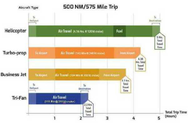 XTI Aircraft Company began operations in 2012. XTI is an aircraft manufacturer that is developing a “vertical takeoff airplane” – the TriFan 600. This first-of-its-kind fixed-wing airplane combines features of a private jet allowing high speed travel over long distances in comfort, with the capability to take off and land like a helicopter. A primary driver of why people choose to fly privately is the time they save traveling versus flying commercially. XTI analyzed the market for a vertical takeoff airplane. It determined that existing aircraft are unable to save as many travel hours as the TriFan 600, which potentially reduces total trip times by as much as half. XTI believes that offering a product that reaches over 20 times the number of U.S. airports than the airlines, over three times the number of airports than business jets can fly into, that departs and lands in remote locations without an airstrip, and translates to significant time savings, could result in a successful business within a multi-billion dollar industry.