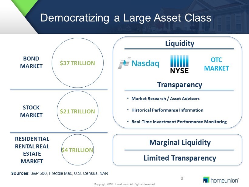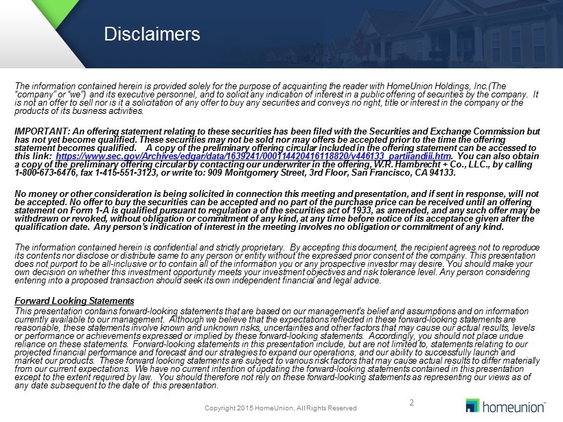 Copyright 2015 HomeUnion, All Rights Reserved Disclaimers 2 The information contained herein is provided solely for the purpose of acquainting the reader with HomeUnion Holdings, Inc.(The “company” or “we”) and its executive personnel, and to solicit any indication of interest in a public offering of securities by the company. It is not an offer to sell nor is it a solicitation of any offer to buy any securities and conveys no right, title or interest i n t he company or the products of its business activities. IMPORTANT: An offering statement relating to these securities has been filed with the Securities and Exchange Commission but has not yet become qualified. These securities may not be sold nor may offers be accepted prior to the time the offering statement becomes qualified. A copy of the preliminary offering circular included in the offering statement can be accesse d t o this link: https://www.sec.gov/Archives/edgar/data/1639241/000114420416118820/v446133_partiiandiii.htm . You can also obtain a copy of the preliminary offering circular by contacting our underwriter in the offering, W.R. Hambrecht + Co., LLC., by cal lin g 1 - 800 - 673 - 6476, fax 1 - 415 - 551 - 3123, or write to: 909 Montgomery Street, 3rd Floor, San Francisco, CA 94133 . No money or other consideration is being solicited in connection this meeting and presentation, and if sent in response, will no t be accepted. No offer to buy the securities can be accepted and no part of the purchase price can be received until an offeri ng statement on Form 1 - A is qualified pursuant to regulation a of the securities act of 1933, as amended, and any such offer may be withdrawn or revoked, without obligation or commitment of any kind, at any time before notice of its acceptance given after t he qualification date. Any person’s indication of interest in the meeting involves no obligation or commitment of any kind. The information contained herein is confidential and strictly proprietary. By accepting this document, the recipient agrees not to reproduce its contents nor disclose or distribute same to any person or entity without the expressed prior consent of the company. This pr esentation does not purport to be all - inclusive or to contain all of the information you or any prospective investor may desire. You should make your own decision on whether this investment opportunity meets your investment objectives and risk tolerance level. Any person con sid ering entering into a proposed transaction should seek its own independent financial and legal advice. Forward Looking Statements This presentation contains forward - looking statements that are based on our management’s belief and assumptions and on informati on currently available to our management. Although we believe that the expectations reflected in these forward - looking statements are reasonable, these statements involve known and unknown risks, uncertainties and other factors that may cause our actual resul ts, levels or performance or achievements expressed or implied by these forward - looking statements. Accordingly, you should not place undu e reliance on these statements. Forward - looking statements in this presentation include, but are not limited to, statements relating to our projected financial performance and forecast and our strategies to expand our operations, and our ability to successfully launch and market our products. These forward looking statements are subject to various risk factors that may cause actual results to d iff er materially from our current expectations. We have no current intention of updating the forward - looking statements contained in this presen tation except to the extent required by law. You should therefore not rely on these forward - looking statements as representing our vie ws as of any date subsequent to the date of this presentation.