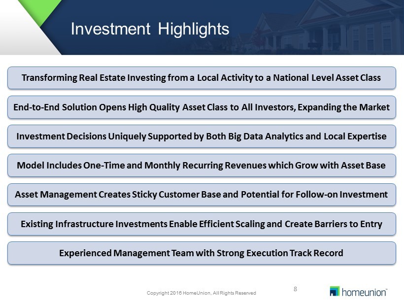 Transaction Summary Copyright 2016 HomeUnion, All Rights Reserved 7 Issuer Listing / Ticker Shares Offered Price Range Use of Proceeds Lock - Up Period Bookrunner Expected Pricing HomeUnion , Inc. NASDAQ / HMU TBD TBD Support growth in business by scaling Technology, Marketing and Operating Capabilities, Working Capital and Loan Repayment 180 Days W.R. Hambrecht + Co. TBD