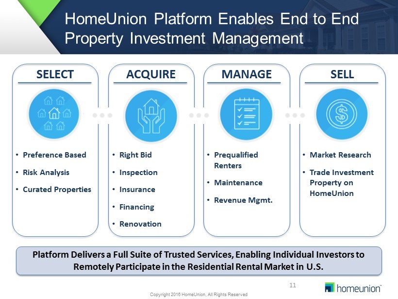 Copyright 2016 HomeUnion, All Rights Reserved 10 BIG DATA Driven Investment Analysis Complemented by Local Real Estate Experts Proprietary Investment Algorithms Local Infrastructure in Each Market 110,000,000 PROPERTIES (SFR) 200,000 NEIGHBORHOODS Curated Properties Over 50 Metrics Analyzed Price Rent Transactions Crime Schools Population Employers Credit Construction Income Local Experts Validate Data Science Employees in 18 Local Regions Currently Drives Decisions on When and Where to Invest as well as Expected Yield and Growth • Perform Market Diligence • Negotiate Transactions • Conduct Property Appraisals • Verify Bid Ranges • Arrange for Inspections & Insurance • Manage Closing Process