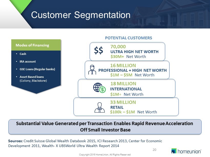 Business Model Creates Several Revenue Opportunities per Customer Copyright 2016 HomeUnion , All Rights Reserved 19 Year 0 Year 1 Year 2 Year 3 Year 4 Year 5 Transaction Revenue Asset Management Revenue • Average Investor Today Purchases approximately 2 ½ Properties • Recurring Revenue Increases Customer Value Over Time TRANSACTION & ASSET MANAGEMENT POTENTIAL FOR MULTIPLE INVESTMENTS REFERRAL OPPORTUNITIES ONGOING Revenue Opportunities Cumulative Revenue per Investor ILLUSTRATIVE EXAMPLE OF ONE PROPERTY