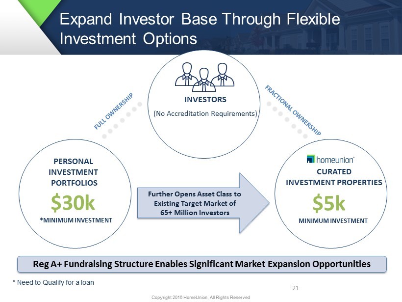 Customer Segmentation Copyright 2016 HomeUnion, All Rights Reserved 20 Modes of Financing • Cash • IRA account • GSE Loans (Regular banks) • Asset Based loans (Colony, Blackstone) Sources : Credit Suisse Global Wealth Databook 2015, ICI Research 2013, Center for Economic Development 2011, Wealth - X UBSWorld Ultra Wealth Report 2014 POTENTIAL CUSTOMERS 33 MILLION RETAIL $100k – $1M Net Worth 16 MILLION PROFESSIONAL + HIGH NET WORTH $1M – $5M Net Worth INTERNATIONAL 18 MILLION $1M + Net Worth 70,000 $30M+ Net Worth ULTRA HIGH NET WORTH $$ Substantial Value Generated per Transaction Enables Rapid Revenue Acceleration Off Small Investor Base