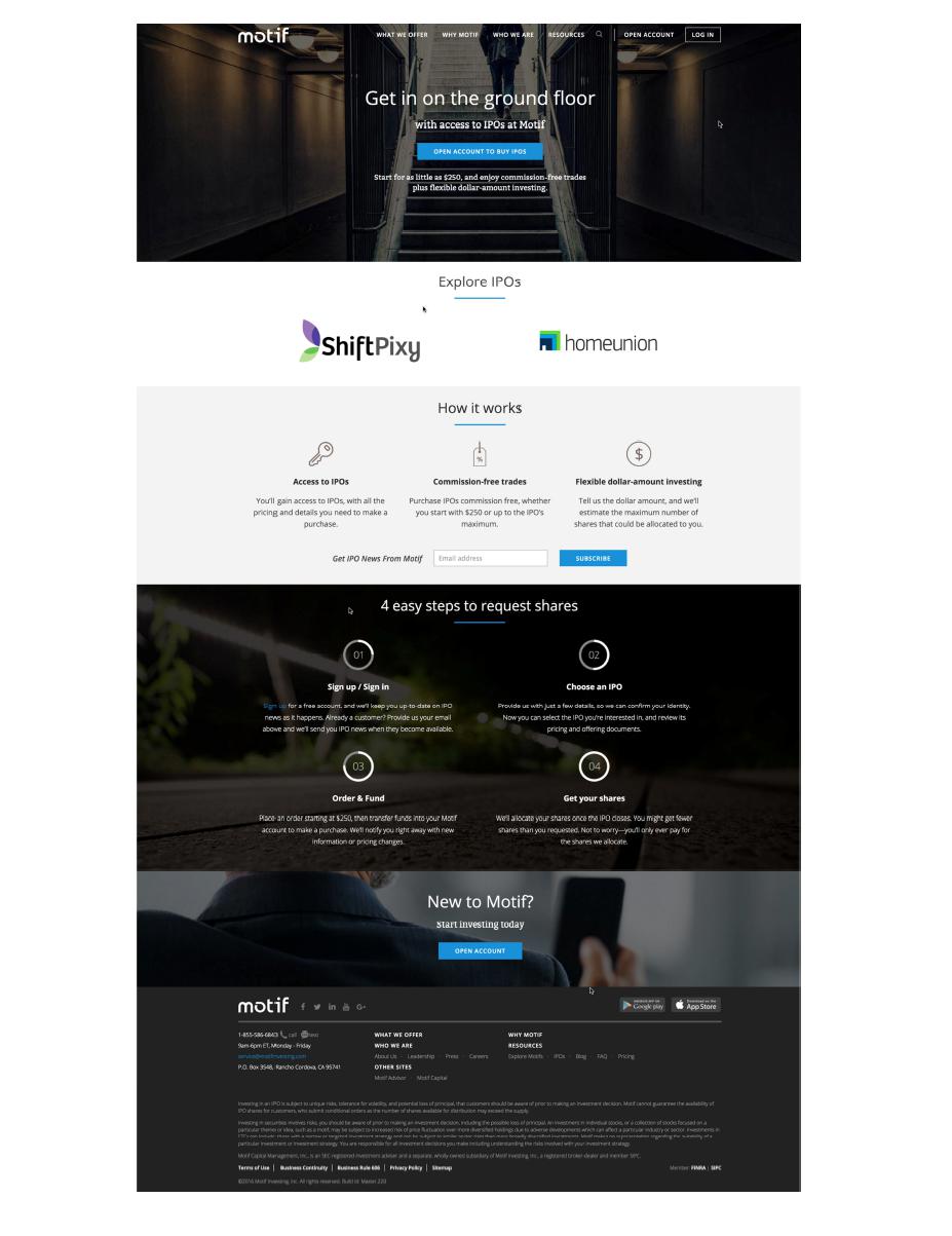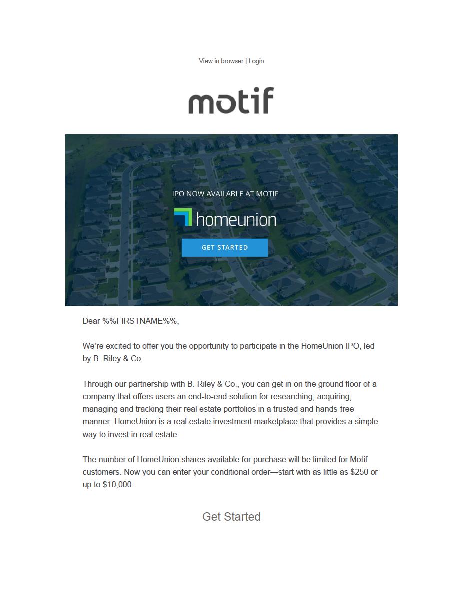 As the company's founder & CEO, it's an honor to present you with this offer - to purchase shares in the HomeUnion IPO starting with as little as $250. Provided by Motif Investing and led by B. Riley & Co., this offering is made under SEC Regulation A.