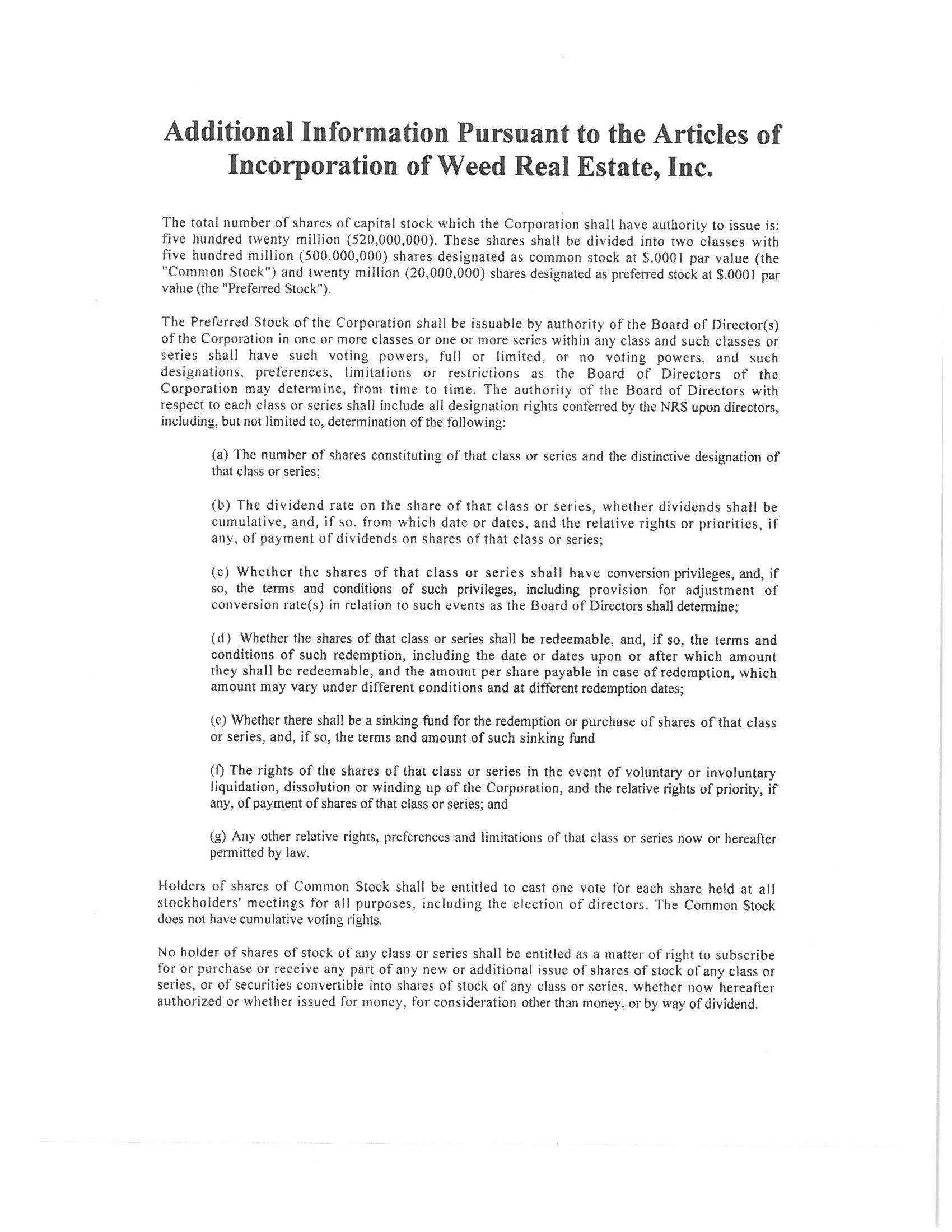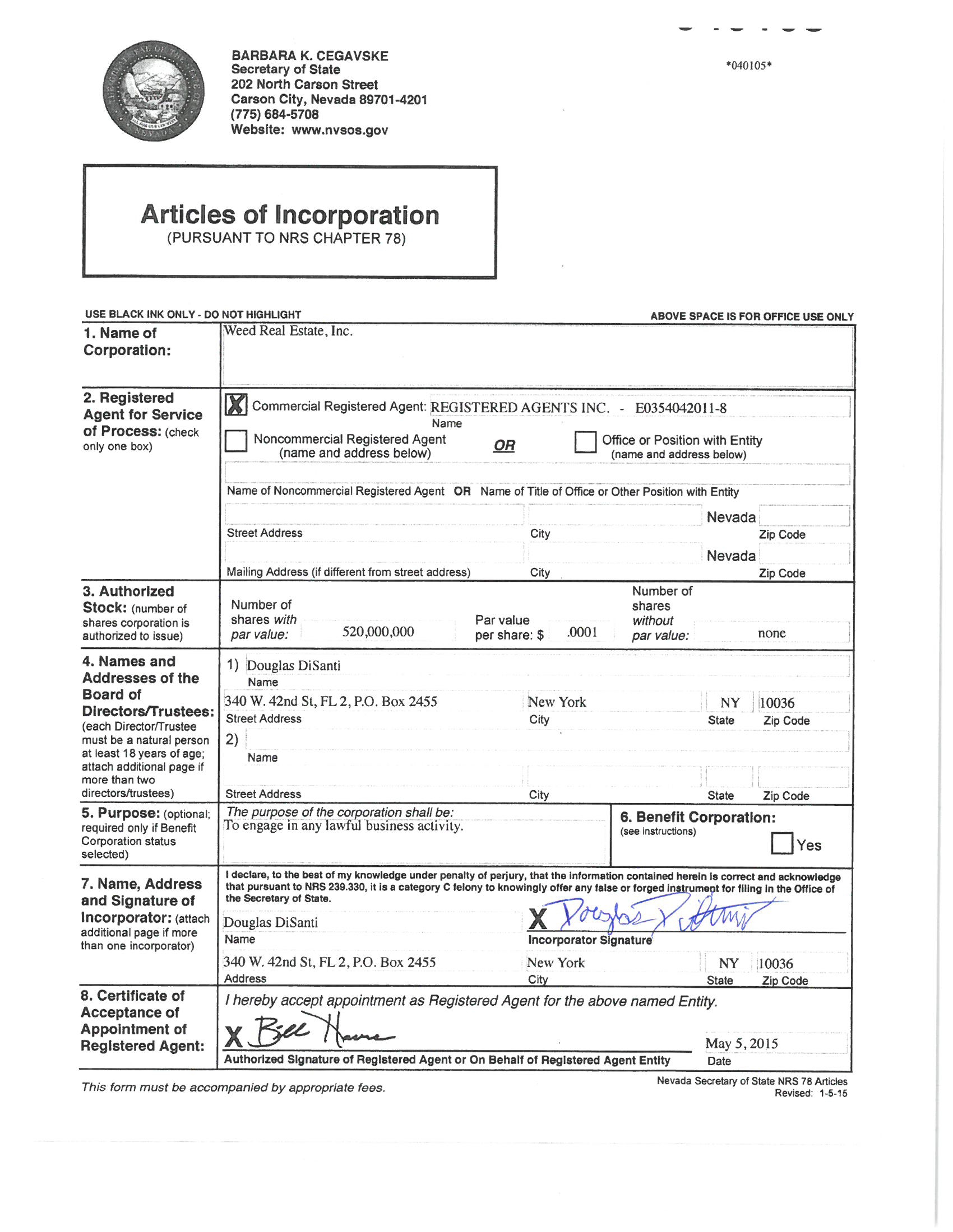 Weed Real Estate, Inc., a Nevada corporation (“the Company”) was incorporated under the laws of the State of Nevada on May 5, 2015.