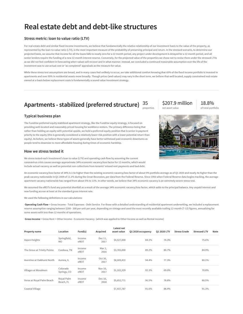 Real estate debt and debt-like structures Stress metric: loan to value ratio (LTV) For real estate debt and similar fixed-income investments, we believe that fundamentally the relative relationship of our investment basis to the value of the property, as represented by the loan-to-value ratio (LTV), is the most important measure of the probability of preserving principal and return. In the stressed scenario, to determine our projected basis, we assume that income for all the loans falls to nearly zero for a 12 month period, any project under development is delayed for a 12 month period, and all senior lenders require the funding of a new 12 month interest reserve. Conversely, for the projected value of the properties we chose not to revise them under the stressed LTVs as we did not feel confident in forecasting when values will recover and in what manner. Instead, we concluded a continued reasonable assumption over the life of the investment was to use actual cost or ‘as completed’ appraisals as the measure for value. While these stress test assumptions are broad, and in many cases feel unlikely to occur, we take additional comfort knowing that 65% of the fixed income portfolio is invested in apartments and over 95% in residential assets more broadly. Though prices (and values) may vary in the short term, we believe that well located, supply constrained real estate owned at a basis below replacement costs is fundamentally a sound value investment strategy. Apartments - stabilized (preferred structure) 35 properties $207.9 million net asset value 18.8% of total portfolio An economic vacancy/loss factor of 34% is 2.5x higher than the existing economic vacancy/loss factor of about 9% portfolio average as of Q1 2020 and nearly 4x higher than the peak vacancy nationwide in Q1 2009 of 11.1% during the Great Recession, per data from the Federal Reserve. Since 1956 when Federal Reserve data begins tracking, the average apartment vacancy nationwide has ranged from about 5% to 11%. In other words, we believe that 34% economic vacancy is an extremely severe stress test. We assumed the eREITs fund any potential shortfall as a result of the average 34% economic vacancy/loss factor, which adds to the principal balance. Any unpaid interest and new funding accrue at least at the standard gross interest rate. We used the following definitions in our calculations: Operating Cash Flow = Gross Income - Total Expenses - Debt Service For those with a detailed understanding of residential apartment underwriting, we included a replacement reserve assumption ranging between $200 - 300 per unit per year, depending on vintage and used the most recently available trailing 12-month (T-12) figures, annualizing for some assets with less than 12 months of operations. Gross Income = Gross Rent + Other Income - Economic Vacancy (which was applied to Other Income as well as Rental Income) Property name Location Fund(s) Acquired Latest net asset value Q1 2020 occupancy Q1 2020 LTV Stress Grade Stressed LTV Note Springfield, MO Income eREIT Dec 11, 2017 $4,527,000 84.1% 74.3% 75.6% Cordova, TN Income eREIT Mar 2, 2016 $3,765,000 89.2% 80.7% 84.9% Aurora, IL Income eREIT Oct 30, 2017 $8,009,422 94.4% 77.3% 80.1% Colorado Springs, CO Income eREIT Nov 10, 2017 $1,102,329 92.3% 69.0% 70.8% Royal Palm Beach, FL Income eREIT Dec 10, 2018 $5,652,771 96.5% 78.8% 80.5% $7,437,787 91.6% 88.4% 91.3%Typical business plan The Fundrise preferred equity stabilized apartment strategy, like the Fundrise equity strategy, is focused on providing well-located and reasonably priced housing for workforce renters. The primary difference being that rather than holding an equity with potential upside, we hold a preferred equity position that is senior in payment priority to the equity (this is generally considered a relatively lower risk position with a lower potential return than equity). As before, we believe these types of assets generally have better withstood past economic downturns as people tend to downsize to more affordable housing during times of economic hardship. How we stress tested it We stress tested each investment’s loan to value (LTV) and operating cash flow by assuming the current coronavirus crisis causes average approximate 34% economic vacancy/loss factor for 12 months, which would include actual vacancy as well as potential non-collections from tenants’ missed rent payments and bad debt.