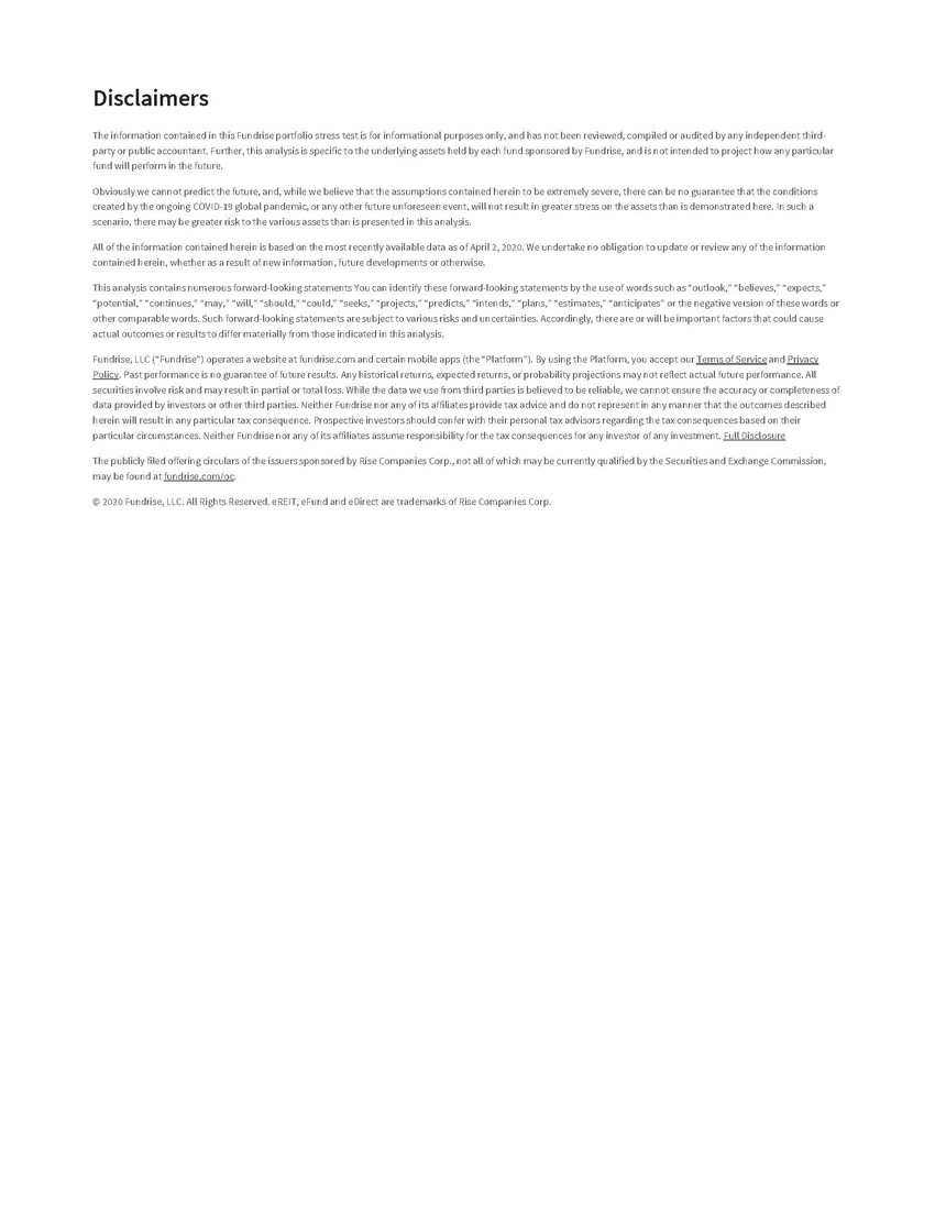 Disclaimers The information contained in this Fundrise portfolio stress test is for informational purposes only, and has not been reviewed, compiled or audited by any independent thirdparty or public accountant. Further, this analysis is specific to the underlying assets held by each fund sponsored by Fundrise, and is not intended to project how any particular fund will perform in the future. Obviously we cannot predict the future, and, while we believe that the assumptions contained herein to be extremely severe, there can be no guarantee that the conditions created by the ongoing COVID-19 global pandemic, or any other future unforeseen event, will not result in greater stress on the assets than is demonstrated here. In such a scenario, there may be greater risk to the various assets than is presented in this analysis. All of the information contained herein is based on the most recently available data as of April 2, 2020. We undertake no obligation to update or review any of the information contained herein, whether as a result of new information, future developments or otherwise. This analysis contains numerous forward-looking statements You can identify these forward-looking statements by the use of words such as “outlook,” “believes,” “expects,” “potential,” “continues,” “may,” “will,” “should,” “could,” “seeks,” “projects,” “predicts,” “intends,” “plans,” “estimates,” “anticipates” or the negative version of these words or other comparable words. Such forward-looking statements are subject to various risks and uncertainties. Accordingly, there are or will be important factors that could cause actual outcomes or results to differ materially from those indicated in this analysis. Fundrise, LLC (“Fundrise”) operates a website at fundrise.com and certain mobile apps (the “Platform”). By using the Platform, you accept our Terms of Service and Privacy Policy. Past performance is no guarantee of future results. Any historical returns, expected returns, or probability projections may not reflect actual future performance. All securities involve risk and may result in partial or total loss. While the data we use from third parties is believed to be reliable, we cannot ensure the accuracy or completeness of data provided by investors or other third parties. Neither Fundrise nor any of its affiliates provide tax advice and do not represent in any manner that the outcomes described herein will result in any particular tax consequence. Prospective investors should confer with their personal tax advisors regarding the tax consequences based on their particular circumstances. Neither Fundrise nor any of its affiliates assume responsibility for the tax consequences for any investor of any investment. Full Disclosure The publicly filed offering circulars of the issuers sponsored by Rise Companies Corp., not all of which may be currently qualified by the Securities and Exchange Commission, may be found at fundrise.com/oc. © 2020 Fundrise, LLC. All Rights Reserved. eREIT, eFund and eDirect are trademarks of Rise Companies Corp.