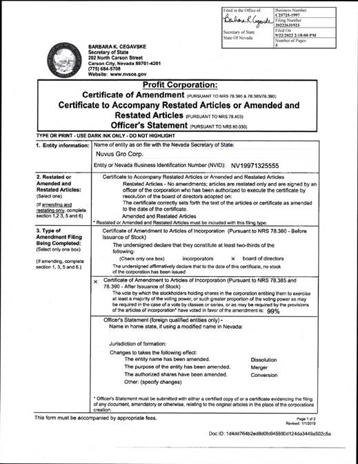 0001671132-22-000005.txt : 20221101 0001671132-22-000005.hdr.sgml : 20221101 20221101133800 ACCESSION NUMBER: 0001671132-22-000005 CONFORMED SUBMISSION TYPE: 1-A PUBLIC DOCUMENT COUNT: 24 FILED AS OF DATE: 20221101 DATE AS OF CHANGE: 20221101 FILER: COMPANY DATA: COMPANY CONFORMED NAME: Nuvus Gro Corp CENTRAL INDEX KEY: 0001671132 STANDARD INDUSTRIAL CLASSIFICATION: AGRICULTURE SERVICES [0700] IRS NUMBER: 465145215 STATE OF INCORPORATION: NV FISCAL YEAR END: 1231 FILING VALUES: FORM TYPE: 1-A SEC ACT: 1933 Act SEC FILE NUMBER: 024-12048 FILM NUMBER: 221349481 BUSINESS ADDRESS: STREET 1: 10901 ROOSEVELT BLVD STREET 2: SUITE 1000C CITY: SAINT PETERSBURG STATE: FL ZIP: 33716 BUSINESS PHONE: 7274179338 MAIL ADDRESS: STREET 1: 10901 ROOSEVELT BLVD STREET 2: SUITE 1000C CITY: SAINT PETERSBURG STATE: FL ZIP: 33716 FORMER COMPANY: FORMER CONFORMED NAME: HempTech Corp DATE OF NAME CHANGE: 20160401 1-A 1 primary_doc.xml 1-A LIVE 0001671132 XXXXXXXX false false Nuvus Gro Corp NV 1997 0001671132 7900 46-5145215 1 0 3811 Airport Pulling Road North #203 Naples FL 34105 8332277683 nantaki@regdresources.com Other 175725.00 0.00 432358623.00 0.00 432579903.00 18912.00 0.00 432741335.00 -161432.00 432579903.00 35445.00 207088.00 0.00 35445.00 0.00 0.00 Audits LLC Common Stock 3566945290 67075W108 OTC Link LLC an inter-dealer quotation system 0 0 true true false Tier2 Audited Equity (common or preferred stock) Y Y N Y N N 11718750000 3566945290 0.0064 52508415.52 22491584.48 0.00 0.00 75000000.00 false true AL AK AZ AR CA CO CT DE DC FL GA HI ID IL IN IA KS KY LA ME MD MA MI MN MS MO MT NE NV NH NJ NM NY NC ND OH OK OR PA PR RI SC SD TN TX UT VT VA WA WV WI WY A0 A1 A2 A3 A4 A5 A6 A7 A8 A9 B0 Z4 AL AK AZ AR CA CO CT DE DC FL GA HI ID IL IN IA KS KY LA ME MD MA MI MN MS MO MT NE NV NH NJ NM NY NC ND OH OK OR PA PR RI SC SD TN TX UT VT VA WA WV WI WY A0 A1 A2 A3 A4 A5 A6 A7 A8 A9 B0 Z4 false Nuvus Gro Corp Common Stock 3566945290 0 0 Rule 4(2) of the Securities Act of 1933, as amended, and/or Rule 506 as promulgated under Regulation D. PART II AND III 2 partiiandiiii.htm