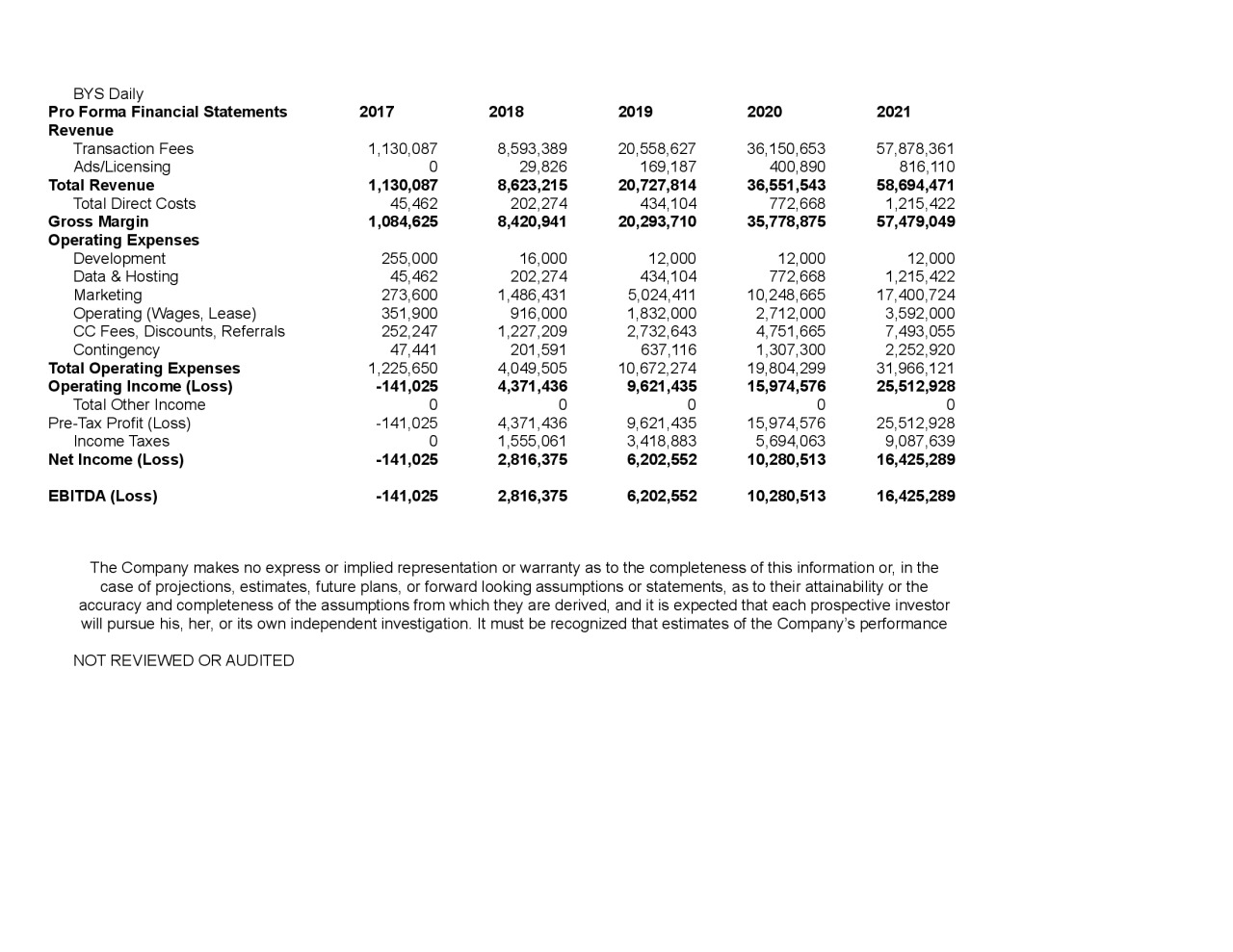 0001625242-16-000135.txt : 20160728 0001625242-16-000135.hdr.sgml : 20160728 20160728120232 ACCESSION NUMBER: 0001625242-16-000135 CONFORMED SUBMISSION TYPE: C/A PUBLIC DOCUMENT COUNT: 57 FILED AS OF DATE: 20160728 DATE AS OF CHANGE: 20160728 FILER: COMPANY DATA: COMPANY CONFORMED NAME: BYS Daily CENTRAL INDEX KEY: 0001674816 IRS NUMBER: 811517235 STATE OF INCORPORATION: VA FISCAL YEAR END: 1231 FILING VALUES: FORM TYPE: C/A SEC ACT: 1933 Act SEC FILE NUMBER: 020-22873 FILM NUMBER: 161789074 BUSINESS ADDRESS: STREET 1: 42384 GRAHAMS STABLE SQ CITY: ASHBURN STATE: VA ZIP: 20148 BUSINESS PHONE: 7035827371 MAIL ADDRESS: STREET 1: 8045 FAREHOLM DRIVE STREET 2: NA CITY: LOS ANGELES STATE: CA ZIP: 90046 C/A 1 primary_doc.xml C/A 0001674816 XXXXXXXX 020-22873 LIVE false false true true Extending the raise deadline for the investment. BYS Daily. Inc. Corporation VA 05-11-2016 8045 Fareholm Drive NA Los Angeles CA 90046 www.sydeapp.com Venture.co Brokerage Services LLC 0001625242 008-69560 173924 7% of Funds raised None Common Stock 12000 83.33000 NA 400000.00 Y Other At the descretion of company management 1000000.00 09-27-2016 0 0.00 0.00 0.00 0.00 0.00 0.00 0.00 0.00 0.00 0.00 0.00 0.00 0.00 0.00 0.00 0.00 0.00 0.00 AL AK AZ AR CA CO CT DE DC FL GA HI ID IL IN IA KS KY LA ME MD MA MI MN MS MO MT NE NV NH NJ NM NY NC ND OH OK OR PA PR RI SC SD TN TX UT VT VA WA WI WY GU BYS Daily /s/ Ryan Huss COO /s/ Ryan Huss COO 07-28-2016 GRAPHIC 2 financial00.jpg begin 644 financial00.jpg M_]C_X 02D9)1@ ! 0$ R #( #_X@H@24-#7U!23T9)3$4 0$ H0 M (0 !M;G1R4D="(%A96B !A8W-P05!03 M ]M4 0 #3+ M ID97-C _ M 'QC<')T !> "AW='!T !H !1B:W!T !M !1R6%E: ! MR !1G6%E: !W !1B6%E: !\ !1R5%)# "! " QG5%)# M "! " QB5%)# "! " QD97-C ")!"!3;V9T=V%R92 R M,#$Q %A96B #S40 ! 1;,6%E:( !8 M65H@ ;Z( #CU #D%A96B !BF0 MX4 !C:6%E:( M "2@ /A ML]C=7)V ! % H #P 4 !D '@ C "@ M+0 R #< .P! $4 2@!/ %0 60!> &, : !M '( =P!\ ($ A@"+ ) E0": M )\ I "I *X L@"W +P P0#& ,L T #5 -L X #E .L \ #V /L! 0$' 0T! M$P$9 1\!)0$K 3(!. $^ 44!3 %2 5D!8 %G 6X!=0%\ 8,!BP&2 9H!H0&I M ;$!N0'! $!Z0'R ?H" P(, A0"'0(F B\". )! DL"5 )= F<" M<0)Z H0"C@*8 J("K *V L$"RP+5 N "ZP+U P #"P,6 R$#+0,X T,#3P-: M V8#<@-^ XH#E@.B ZX#N@/' ],#X /L _D$!@03!" $+00[!$@$501C!'$$ M?@2,!)H$J 2V!,0$TP3A!/ $_@4-!1P%*P4Z!4D%6 5G!7<%A@66!:8%M07% M!=4%Y07V!@8&%@8G!C<&2 99!FH&>P:,!IT&KP; !M$&XP;U!P<'&09!ZP'OP?2!^4'^ @+"!\(,@A&"%H(;@B"")8(J@B^"-((YPC[ M"1 ))0DZ"4\)9 EY"8\)I FZ"<\)Y0G["A$*)PH]"E0*:@J!"I@*K@K%"MP* M\PL+"R(+.0M1"VD+@ N8"[ +R OA"_D,$@PJ#$,,7 QU#(X,IPS #-D,\PT- M#28-0 U:#70-C@VI#<,-W@WX#A,.+@Y)#F0.?PZ;#K8.T@[N#PD/)0]!#UX/ M>@^6#[,/SP_L$ D0)A!#$&$0?A";$+D0UQ#U$1,1,1%/$6T1C!&J$)%ZX7TA?W M&!L80!AE&(H8KQC5&/H9(!E%&6L9D1FW&=T:!!HJ&E$:=QJ>&L4:[!L4&SL; M8QN*&[(;VAP"'"H<4AQ['*,0!YJ'I0>OA[I M'Q,?/A]I'Y0?OQ_J(!4@02!L()@@Q"#P(1PA2"%U(:$ASB'[(B--@U M$S5--8Y",$)R0K5"]T,Z0WU#P$0#1$=$BD3.11)%546: M1=Y&(D9G1JM&\$25^!8+UA]6,M9 M&EEI6;A:!UI66J9:]5M%6Y5;Y5PU7(9O5\/7V%?LV % M8%=@JF#\84]AHF'U8DEBG&+P8T-CEV/K9$!DE&3I93UEDF7G9CUFDF;H9SUG MDV?I:#]HEFCL:4-IFFGQ:DAJGVKW:T]KIVO_;%=LKVT(;6!MN6X2;FMNQ&\> M;WAOT7 K<(9PX'$Z<95Q\')+%V/G:;=OAW M5G>S>!%X;GC,>2IYB7GG>D9ZI7L$>V-[PGPA?(%\X7U!?:%^ 7YB?L)_(W^$ M?^6 1X"H@0J!:X'-@C""DH+T@U>#NH0=A("$XX5'A:N&#H9RAM>'.X>?B 2( M:8C.B3.)F8G^BF2*RHLPBY:+_(QCC,J-,8V8C?^.9H[.CS:/GI &D&Z0UI$_ MD:B2$9)ZDN.339.VE""4BI3TE5^5R98TEI^7"I=UE^"83)BXF229D)G\FFB: MU9M"FZ^<')R)G/>=9)W2GD">KI\=GXN?^J!IH-BA1Z&VHB:BEJ,&HW:CYJ16 MI,>E.*6IIAJFBZ;]IVZGX*A2J,2I-ZFIJARJCZL"JW6KZ:QK_UP'# [,%GP>/"7\+;PUC# MU,11Q,[%2\7(QD;&P\=!Q[_(/%$XIZ#+HO.E&Z=#J6^KEZW#K^^R&[1'MG.XH[K3O0._,\%CPY?%R\?_R MC/,9\Z?T-/3"]5#UWO9M]OOWBO@9^*CY./G'^E?ZY_MW_ ?\F/TI_;K^2_[< M_VW____; $, P(" @(" P(" @,# P,$!@0$! 0$" 8&!08)" H*"0@)"0H, M#PP*"PX+"0D-$0T.#Q 0$1 *#!(3$A 3#Q 0$/_; $,! P,#! ,$" 0$"! + M"0L0$! 0$! 0$! 0$! 0$! 0$! 0$! 0$! 0$! 0$! 0$! 0$! 0$! 0$! 0 M$! 0$! 0$/_ !$( ]T% ,!(@ "$0$#$0'_Q = $ @,! 0$! M !P@$!08) P(!_\0 3! 8" @(! P(% @4!! $5 $" P0%!@<1$@@A M$Q0B,15!"18C,E%"81E(3*8=Y4;"D1W"-Q"R-)]2X/L0^<_RECEJE-_ M4XNX[L-^W_E%K#W7#)U&1D1]HRUD7_H)(C>-XBX-@NY?DB 3V A'*-K[0/8T M/2F$Q\(1ED?'(M_:S;N5(:BK^9UUHFX<9OEU[A<=TU&:RZ)4WSV-?KMM7Y5L M"^9MZG9F%LT-W22TQU/P'G'ZVR:6VE:)$5UQ"%&7LTK0HN4+29^0V7;,V'BVM6-=QJC![2%5(5>-3E29*WJN)-4HS9622(CE=2]?A/[C=X? MOB,S49:WNB-5X5X1GM7]7A]+(MIOZI#ELIA-(:<6B0^PI"'U,?TU&:FTGV)* MB29F/K5;M@HV'EF)90]"@5]*_C\*OF)2X9R9-FVLT(7^23RXE*4F?!P%4-I90BL8S!5$V7WCFXMLE]H[*TE]S:RX,R/U M^..!UFG-[:FW_C3F7:AS.)D58P]],^XTVXTXR[P1]7&G4I<0?!D9=DER7X = MZ($\Q:%B_P *PY%GBV1W]1"S>KF6T6@@S)BN[#*T>^I^N>?7LAW.F-YZ MO\@\07G>H\E.\HVYCE>J4<*1%X?;2A2T='T(7Z)Q'OCCW^?R B;R!H\1R/-W M:K?WCW*SS"BB,/XW=T&.2;2?6R?N*2P^44U26^3)I;;C222?)DK@T\GN_%#& MKO'*_+41:O,*C!9-FRYB59EKSR[*,R3"2D&:'U*>994[R;;3A]BX49D1*(A/ M0 *V4NR6=3;IW.C)M?;(EM7^1UEC62J7![6SBRF$T-:PHT/QF%M&9.LNH,NW MHTGSP-%DD3;5K3;%WC38)<5$S*)V.5U=6OU3^X;M@B$KL7U?_ #CK0T=C#BN M.,N-K,N%&U)0R:N#Y29%SP8LP*L;B\]/#.CG91IW/]SV=':PW'JBT17U-JB1 M&=2?59-R&8YD1E^.R%&7^# =5XES;C9%%<>1N4U3M=9[#7'3#A/<&N%5PT&R MRWR7_6[]2_Z_/SE_@A/HB+5&Z]#V$3!=N>..# =F XK;6Z-7Z*Q;^<]L9C"QVH-Y,=#\@EJ M4ZZ9&9(;;02EN*X(SX2DSX(S_!#G-/\ E7X^[YK+:VU9LRNMV*)KZBR)QMV( MY%9X,_E6W(0A9(^T_OXZ^OR E@!H<&SK$MEXK!S?!;MBXHK,G#B3F"5\;Q(< M4VHT]B(S+LA1<_@^.2Y+@Q\-@;'P;5>.JRS862PZ.J2\W&*1)4?"WG#X0VDB M(U*6H_PDB,S]@.E '-;$V/@^IL2FYWL;)8=#15Q).1-E*,D)-1\)2 M1$1FI1F9$24D9F?HB =* #3Y?E^,8#C5AF.9WD2GI:ID MWYDZ6X2&F4%ZY,S_ ,F9$1?DS,B+V8C33GE_XX;]L["FU3M&!<3ZME4F5&P'< *R91_$G\,,-R6VQ#(]ON1+:CG/UL M^/\ R]:.?%(9<4VXCLB,:5<+2HN4F9'QZ,R%A<3RFCSC%:;-<8F'+I[^OCVE M?(-I;1O1GVTN-+Z+(EIY0I)]5$1ESP9$8#; #AMO;NU M7H;&"S';>9PL=JENDPTZ^E;BWG>#/HVTVE3CBN",^$I/T [D!$F(>6/CMG>M M;C;V,[4J)&)X_P#_ 'TGNDY'.&?!&1.-.I2XDU1; M5D[IS8,7(%5!I*:R4=^,\R2N>JC;?0A?4S(R)1%QZ_("4@'"8-O'56R;S+\> MPC,8EK,P.2W$R VD.)9ANK2M1)^922; I4\C]9DL/1T*4V\IE24MN(2XH_D2:2(DF:O M]/)&0"40$9:3\E-(^1<"=8Z;SZ'D**Q243&DLO1WV.W/4ULO(0X23ZJX5UX/ M@^#]"30 01=^='B?CNQU:GN=T4\?)42OHG&/A?4PU( MYZ_&N2ELV$*(_1DI9<'Z/@!.X"&-L>9'C3H_+8F#;0VK74UY,0AU,3Z>1(4T MA?\ 8IU3+:TLD9>R-PT^O?X]C][<\PO&S1:ZIK9VU:VK=NXR)D!IEE^:X]'7 M_8]UCH6:6U?LLR(C]\& F0!$F9^67CM@&MJC;N4[4J8^*9!ZJI[).23FF7]Q M---)4XHT_P"HB3RD_2N!UVKMKZ\W3A\7/